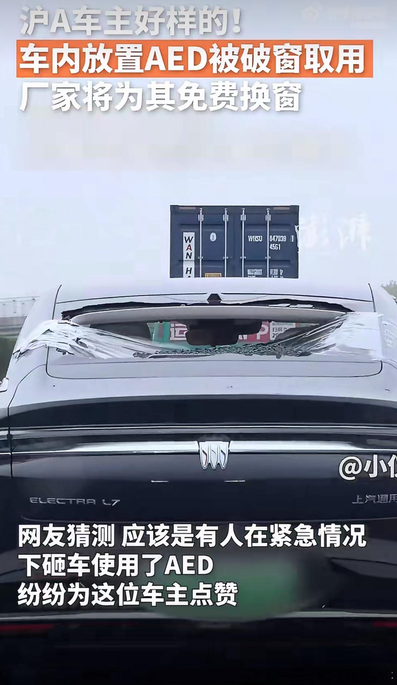 全网点赞沪A别克车主,破碎的后窗,AED标识,对比醒目。视频火后,别克官方火速