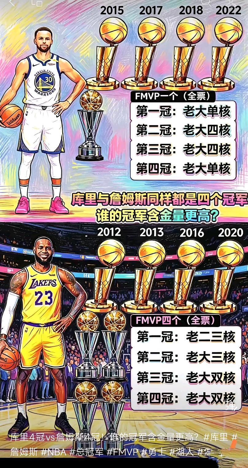 库里和詹姆斯,谁的总决赛含金量高? 两人都没有单人单核的夺冠经历,或多或少都靠队友。 库里第四冠是老大单核,詹姆斯有两次老大双核。 综合两人五五开,库里一人一城夺冠很牛逼,詹姆斯连续换队夺冠也牛逼。 绝代双骄很难分出胜负呀。[大金牙]