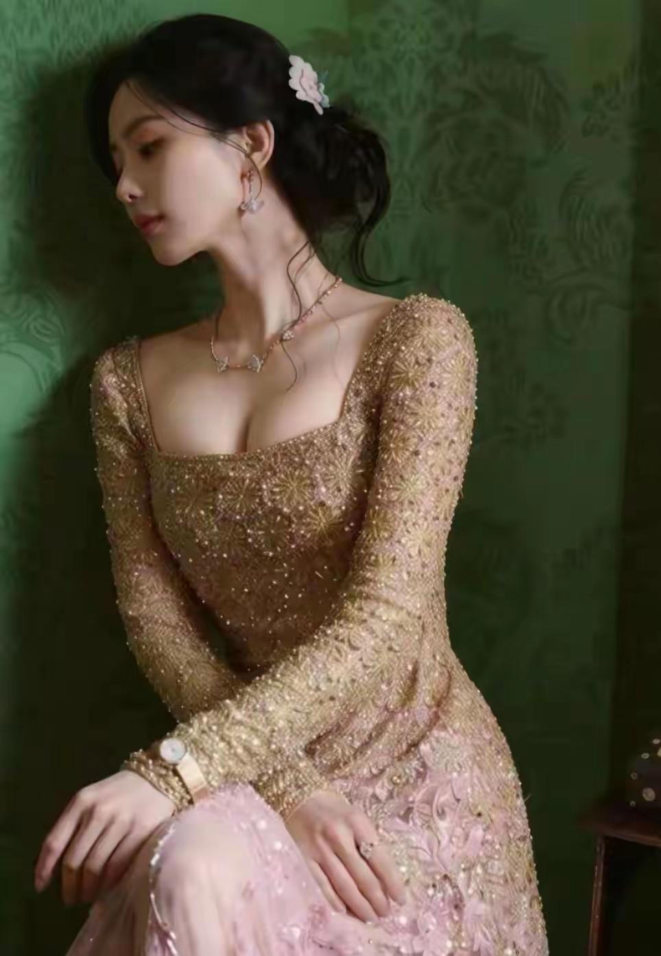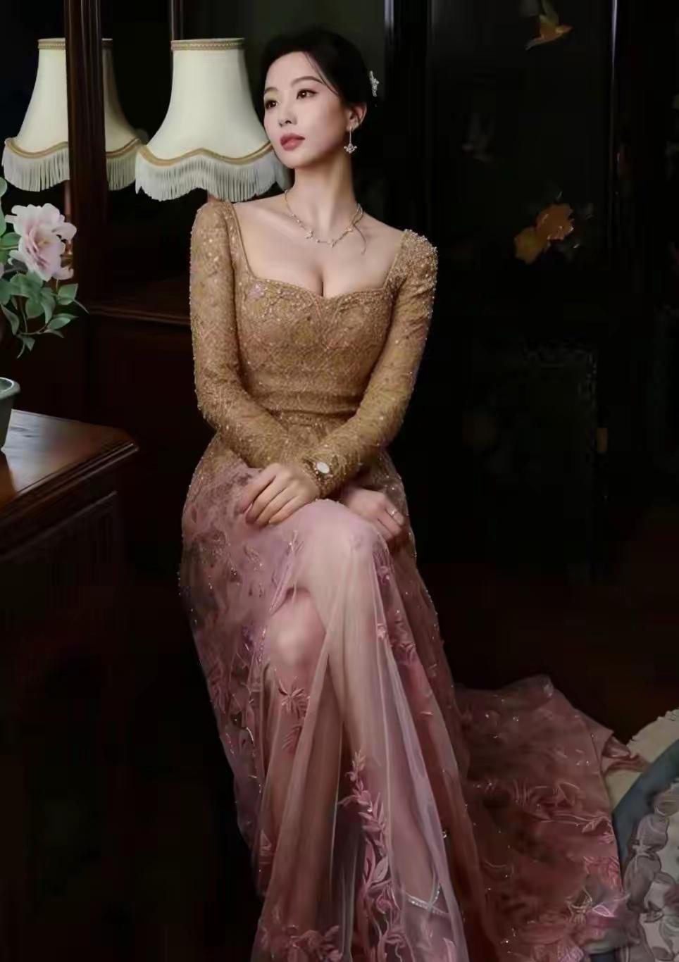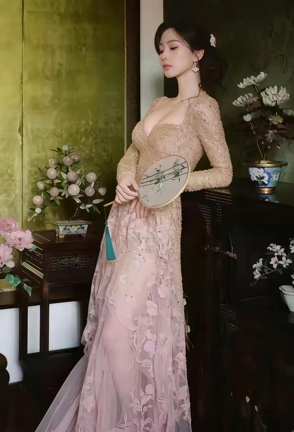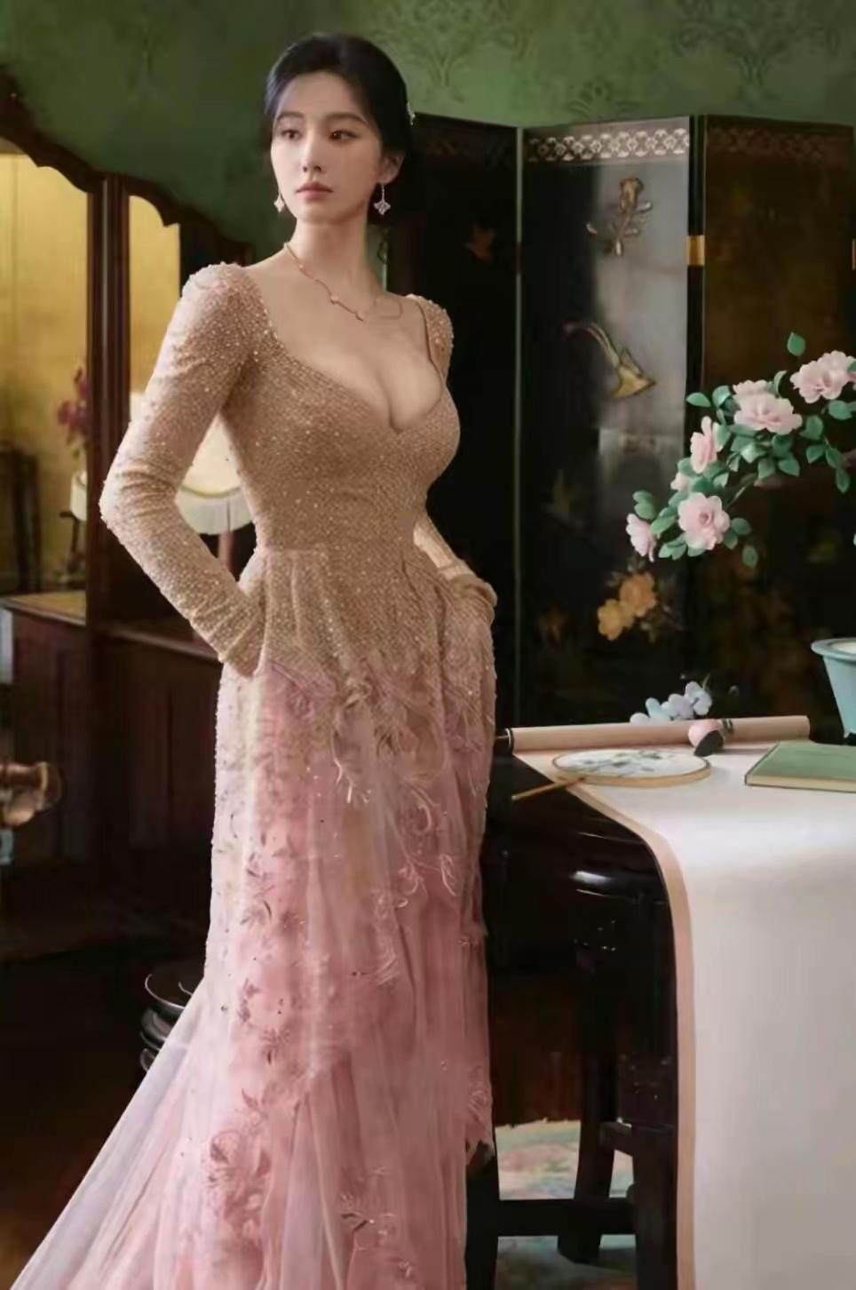 优雅复古风,粉色长裙与古典家具的完美搭配,尽显女性魅力。