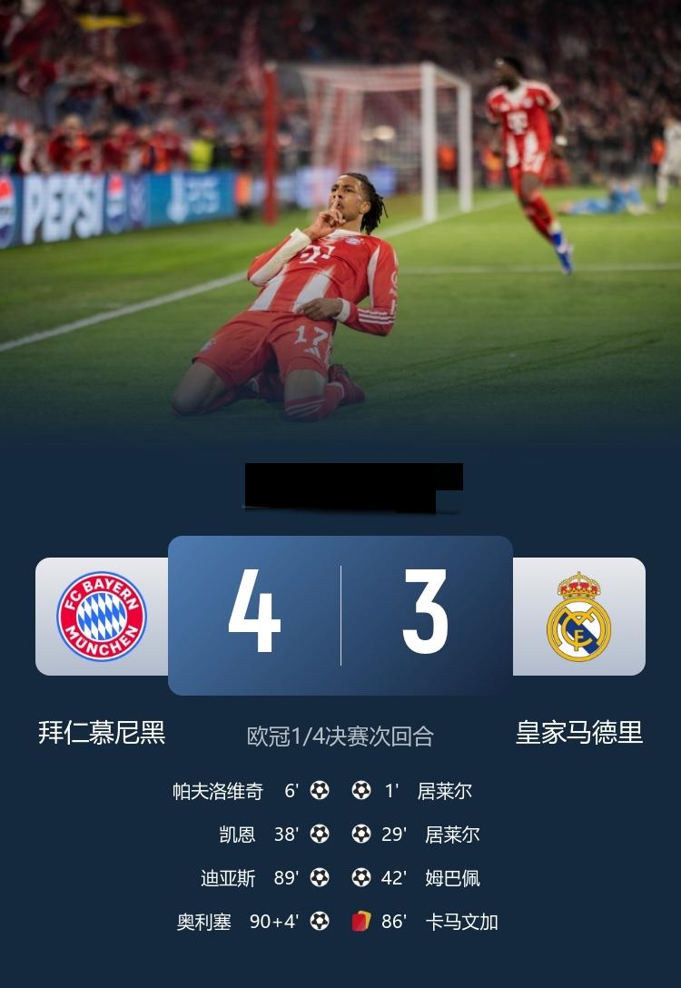 欧冠 拜仁4-3总比分6-4十人皇马 迪亚斯 奥利塞建功,卡马文加染红,姆巴佩破门 4月16日,欧冠1/4决赛次回合,拜仁慕尼黑主场迎战皇马,首回合拜仁2-1皇马。上半场,居莱尔双响,帕夫洛维奇、凯恩破门,姆巴佩破门,下半场,卡马文加替补染红,路易斯·迪亚斯、奥利塞分别建功。最终拜仁4-3十人皇马,总比分拜仁6-4淘汰皇马 晋级四强,半决赛将对阵巴黎