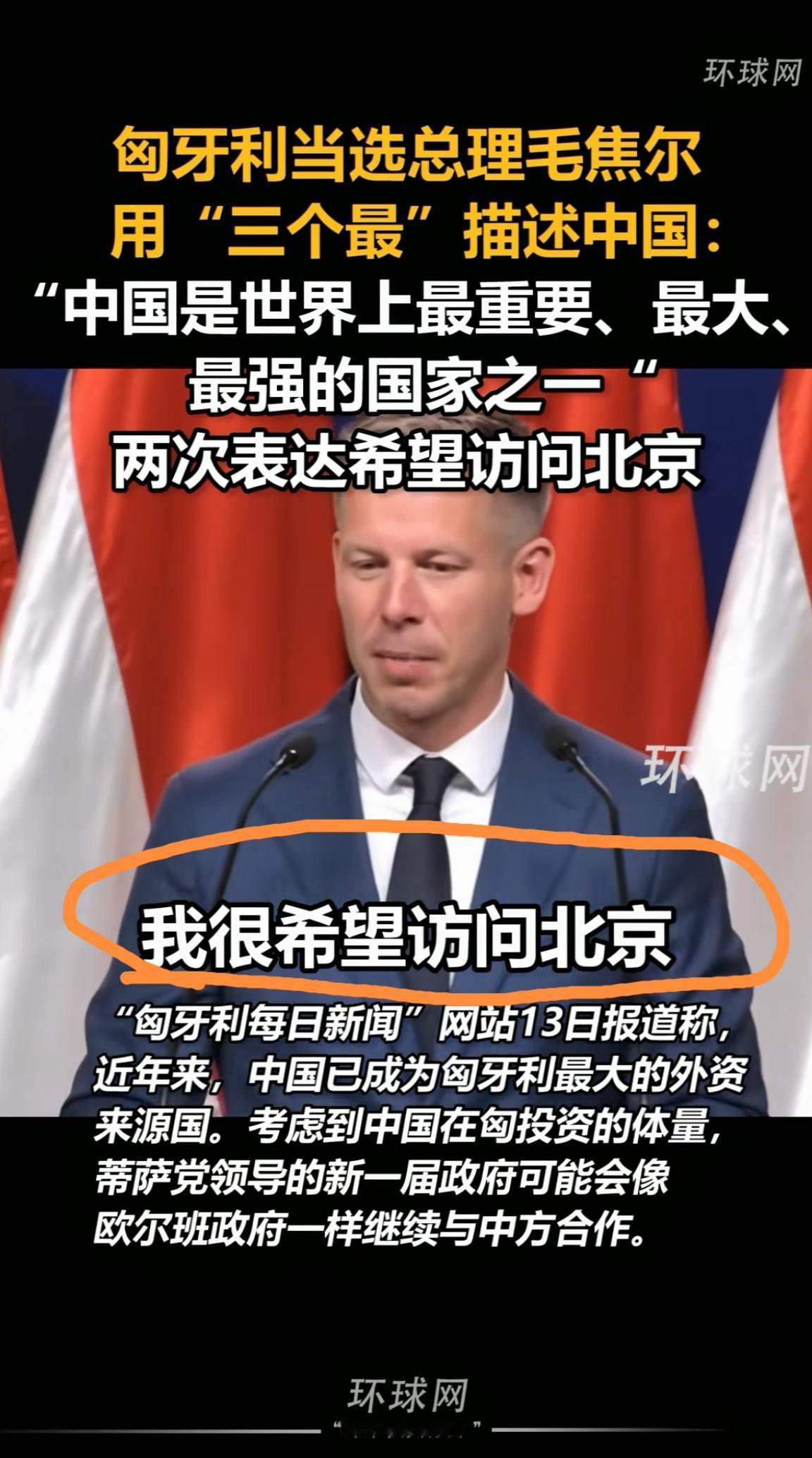 世界上最具讽刺意味的事是什么?我觉得下面这件事也算其中之一。 前两天这哥们当选匈牙利总理,网络上顿时充斥着我国要倒霉了的论调。 结果呢? 这哥们刚当选,就表达了近期非常希望访问我国的意愿。 并且,为表达善意,他直接用三个“最”来形容我国当前的影响力,称我国是“世界上最大、最强、最重要的国家”。最后还着重强调,两国友好符合双方共同利益。 如今看来,相较于国内网络上公知的阴阳怪气,这位国外领导人似乎更务实。