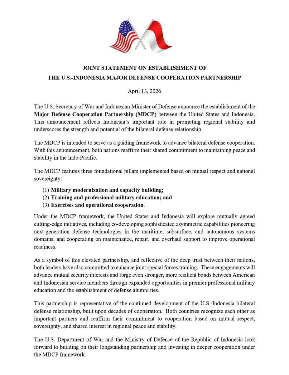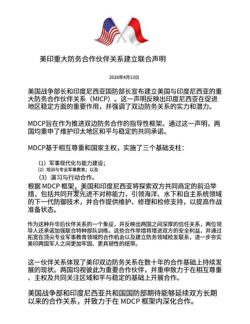 这时候跟老美签「防务合作联合声明」,印尼图什么? 美国主动递来MDCP,要帮印尼搞军事现代化——海事、水下、自主系统,听着很诱人。可问题是,美国正在中东打伊朗,打得还不好看,军力极速下堕。连稀土库存都只够俩月,拿什么给印尼「下一代技术」? 这是一份「全员不高兴,没有赢家」的合作:不签,美国不高兴;签了,就是引狼入室,国内穆斯林不高兴,伊朗不高兴,域内大国不高兴。 那印尼,它图什么? 图「大家都不高兴」的优先级里,谁排第一? 不然,无法解释! Source: FB