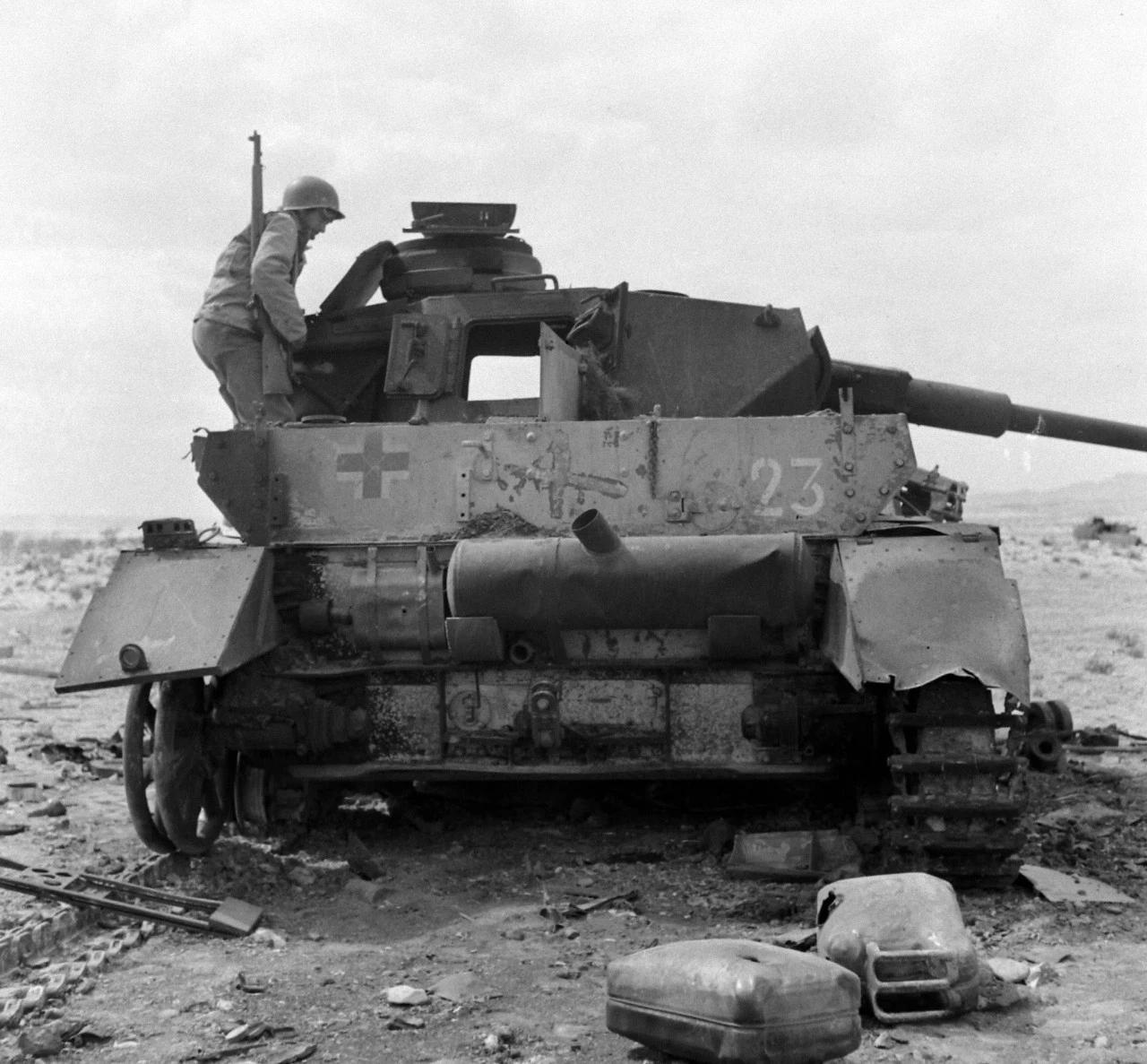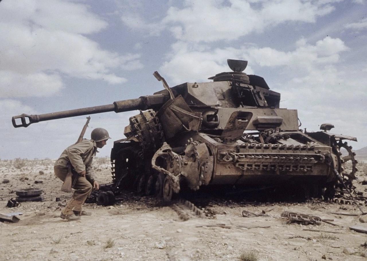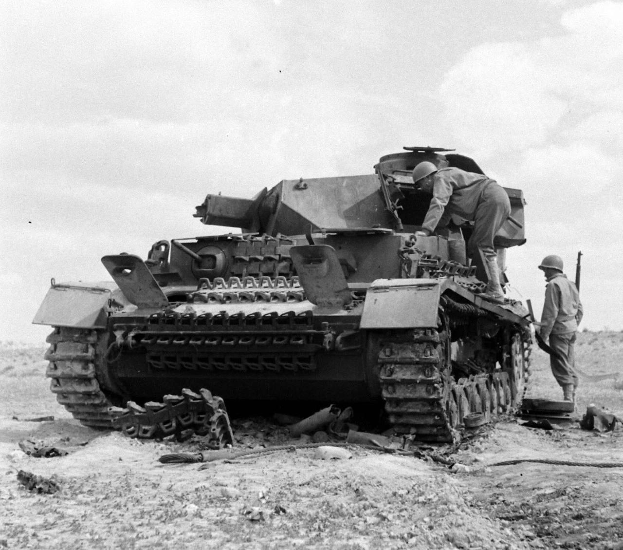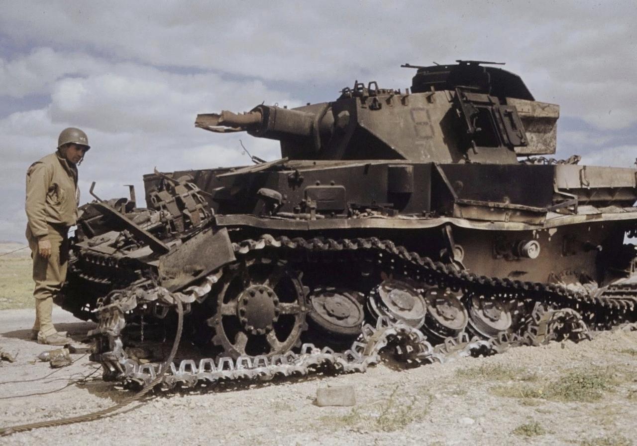 1943年在突尼斯战役的一场战斗之后,美军士兵们在打扫战场时,检查他们在战斗中摧毁的德军IV号坦克。