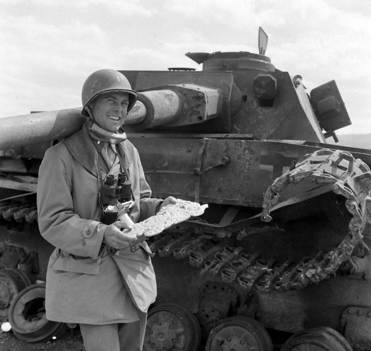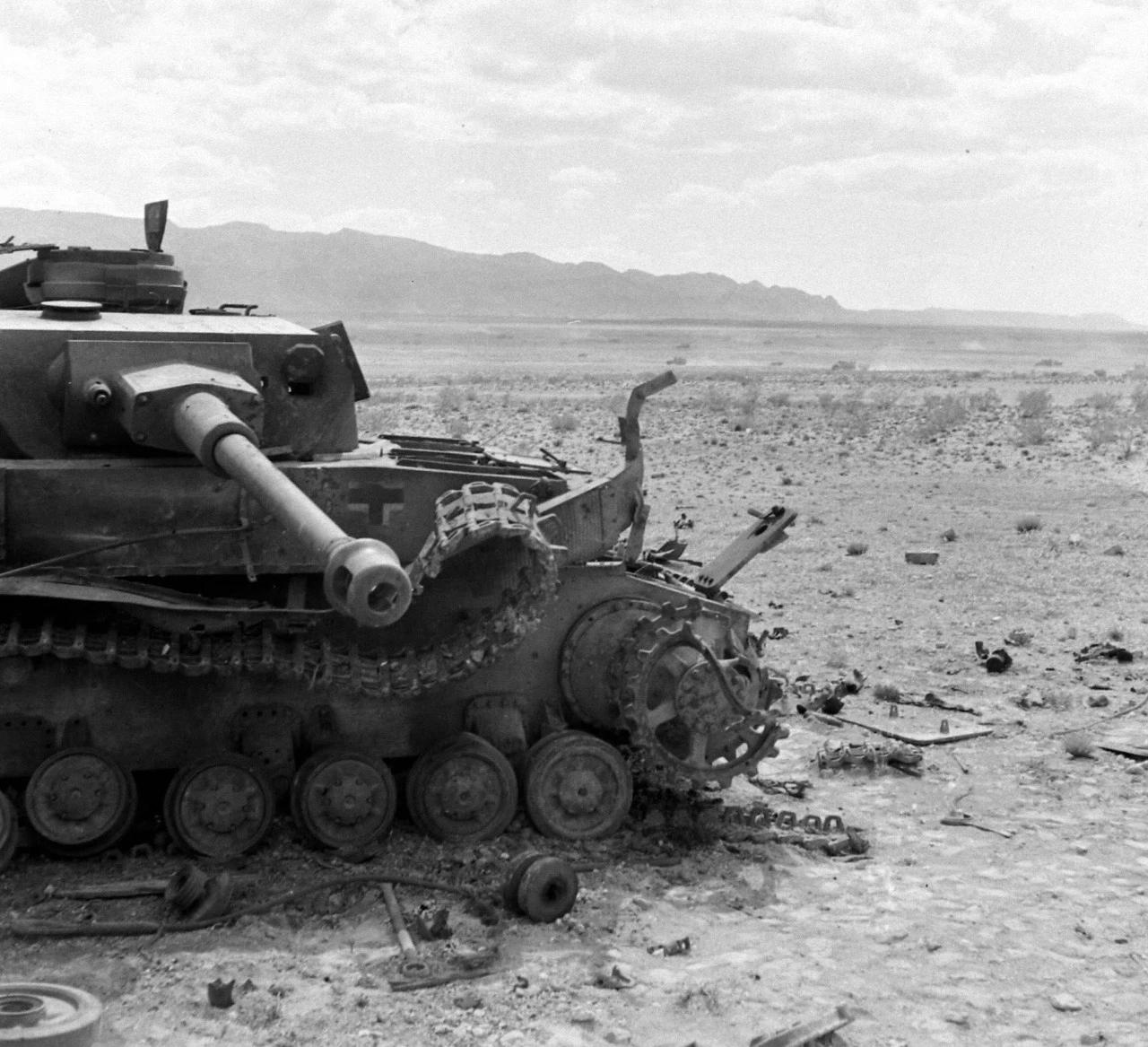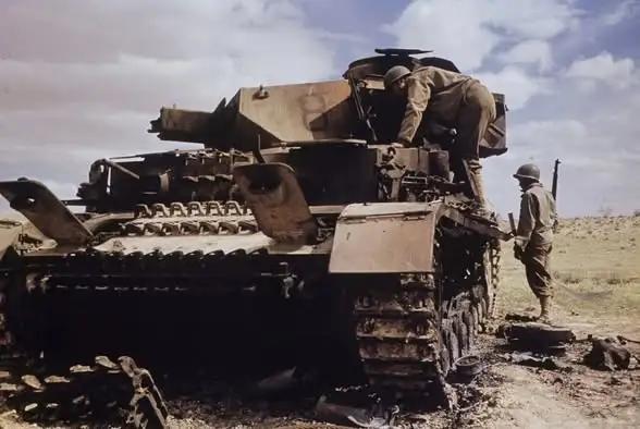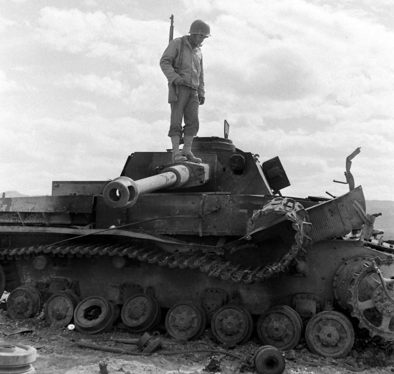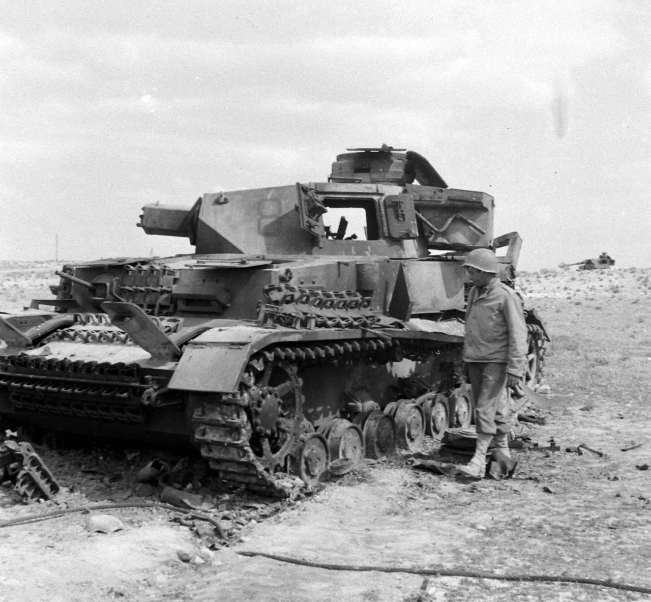 1943年在突尼斯战役的一场战斗之后,美军士兵们在打扫战场时,检查他们在战斗中摧毁的德军IV号坦克。