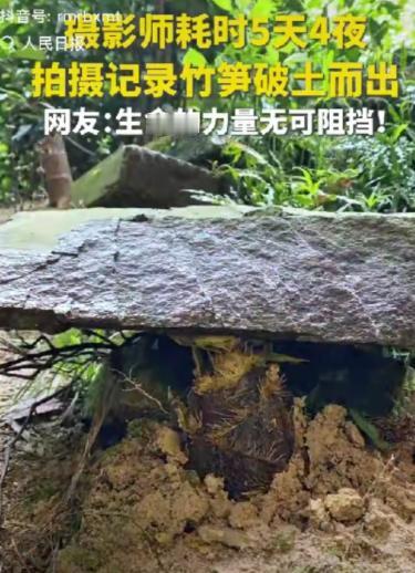 “这竹笋做梦都没想到它上人民日报了!”一男子耗时5天4夜拍竹笋,不料,在拍摄时撞见了震撼一幕:厚重的石板下,一株竹笋硬生生顶开石块,顽强地破土而出。网友:生命的力量,无法阻挡。 人民日报转载的一段短视频,让一株平凡的竹笋意外“出圈”,成为全网热议的焦点。 这段时长不足1分钟的延时视频,无华丽剪辑、无刻意摆拍,用最真实的画面,记录下竹笋在厚重石板重压下奋力破土、向阳生长的震撼瞬间。 也揭开了两段截然不同却同样动人的拍摄故事,让人们看到弱小生命背后不可估量的力量。 这株竹笋的走红,不同于刻意打造的网红热点,源于两个普通人对生活的细微观察与执着坚守,更源于生命本身的韧性。 自然界中这样的生命奇迹并不少见,四川某山区曾发现一株松树,种子落在岩石缝隙中,无肥沃土壤,却在风雨中扎根岩石,历经数十年长成参天大树,用根系撑开岩石,与顶石竹笋一同诠释着“绝境逢生”的生命密码。 最先让这株竹笋进入公众视野的,是一位专注植物生长题材十余年的纪实摄影师,他常年扎根户外,走遍全国山林,对植物生长细节有着极致追求。 此次拍摄春笋,他并非单纯记录生长过程,而是想通过镜头展现其生存韧性,因此做了细致准备。 为找到合适拍摄场景,摄影师提前半个月穿梭于浙江安吉深山,选定一片远离人为干扰、土壤肥沃的原生态毛竹林。 确定地点后,他花费三天观察竹笋生长规律、标记长势较好的点位,再搭建固定机位、调试专业延时摄影设备,确保清晰捕捉破土瞬间。 标记点位中,一处被直径近半米的山坡落石覆盖,石板重量足以压垮幼苗,村民称其落地多年从未有植物生长。 摄影师仅将此处作为对比场景,架设备用机位,未抱期待,重点关注其他无遮挡竹笋。 拍摄期间,安吉山区遭遇连续降雨,让土壤变得松软,为竹笋生长创造了条件。 降雨次日清晨,摄影师检查机位时,意外发现石板缝隙中透出嫩黄笋尖,正紧紧顶着石板底部,虽被压得倾斜,仍在缓慢生长。 这一发现让摄影师立刻调整重心,将所有设备转移到落石旁,开启24小时不间断拍摄。 山林夜晚气温不足10℃,蚊虫叮咬、路面湿滑,拍摄条件艰苦,他每小时检查一次设备,防止受潮移位,五天四夜从未离开拍摄现场。 期间,摄影师家人多次来电劝其放弃,认为石板过厚,竹笋无法突破,纯属浪费时间。 但他始终坚持,称这种看似不可能的生长,最能体现生命的力量,他想通过镜头传递这份绝境中的坚守与突破。 第五天凌晨,天刚泛白,山林弥漫薄雾,这株竹笋借着雨水积蓄的力量,硬生生将石板顶开两指宽豁口,嫩黄带褐的笋身奋力钻出,不顾笋尖破损,直直朝着阳光伸展,完成破土奇迹。 与此同时,另一位普通男子拍摄的类似视频也悄然走红。 该男子家住南方农村,高中辍学后四处打拼,干过小工、跑过龙套,历经挫折却乐观向上,平时爱用手机记录农村日常并偶尔分享。 一天,他在自家院子角落发现,两块石板之间冒出来两棵小竹笋,石板刚好压在笋顶,仅留一丝缝隙。 出于好奇与对生命的敬畏,他用简易手机支架固定手机,不间断拍摄五天四夜。 无专业拍摄技巧、无复杂后期,他用朴素镜头记录竹笋每一点变化:竹笋在重压下缓慢生长,一点点顶起石板,最终破土长出嫩绿笋叶。 这段15秒短视频发布后收获大量点赞,网友被竹笋的韧性和男子的耐心打动。 男子表示,拍摄纯属一时兴起,却在观察中收获感悟:竹笋地下默默扎根、积蓄力量,即便千斤重压也不放弃,这如同生活中的普通人,遭遇挫折时只要坚持努力,终会迎来“破土时刻”。 如今,他凭借拍摄农村日常积累粉丝,还帮乡亲推广笋干、茶叶等农产品。 摄影师的延时视频发布后,迅速引发全网热议,人民日报第一时间转载并配文“势如破竹,生命的力量,无法阻挡”。 网友纷纷留言分享感悟,有人看到了自己的影子,有人读懂了“厚积薄发”的含义。 据悉,这段视频也让安吉这片毛竹林吸引了不少游客前来,近距离感受这株“励志笋”的生长痕迹。 如果各位看官老爷们已经选择阅读了此文,麻烦您点一下关注,既方便您进行讨论和分享,又能带来不一样的参与感,感谢各位看官老爷们的支持!