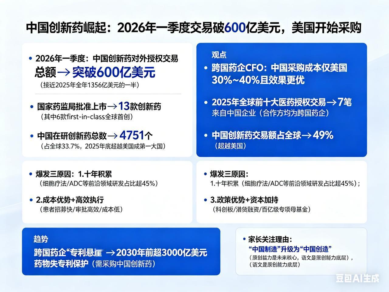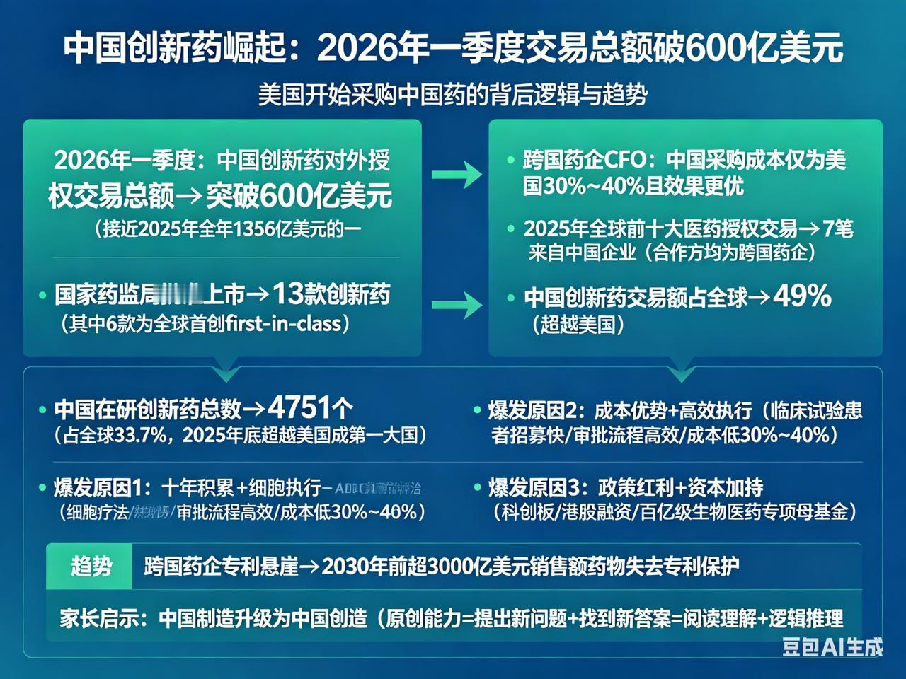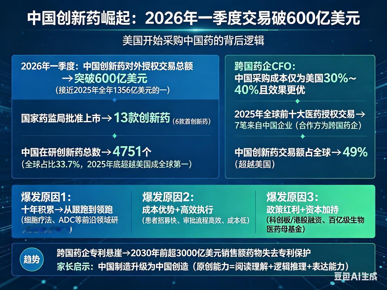 中国药,一个季度卖给美国600亿美元。 2026年一季度,中国创新药对外授权突破600亿美元。 全球前10大医药交易,7笔来自中国企业。 中国在研创新药,已经超越美国成为全球第一。 美国人怎么说? 一家跨国药企CFO:“在中国采购,成本只有美国的30%~40%,效果可能更好。” “中国制造"升级为"中国创造”。 这背后是原创能力。 未来最值钱的,不是执行能力,是原创能力。 而原创能力的底层,是语文。
