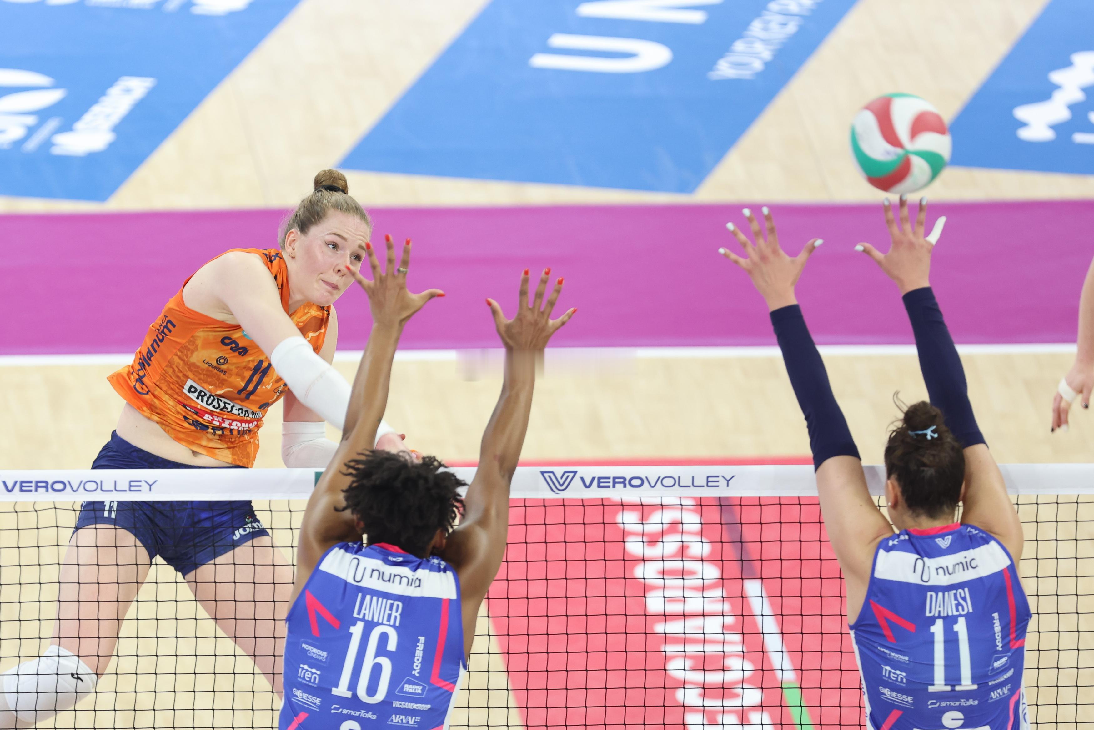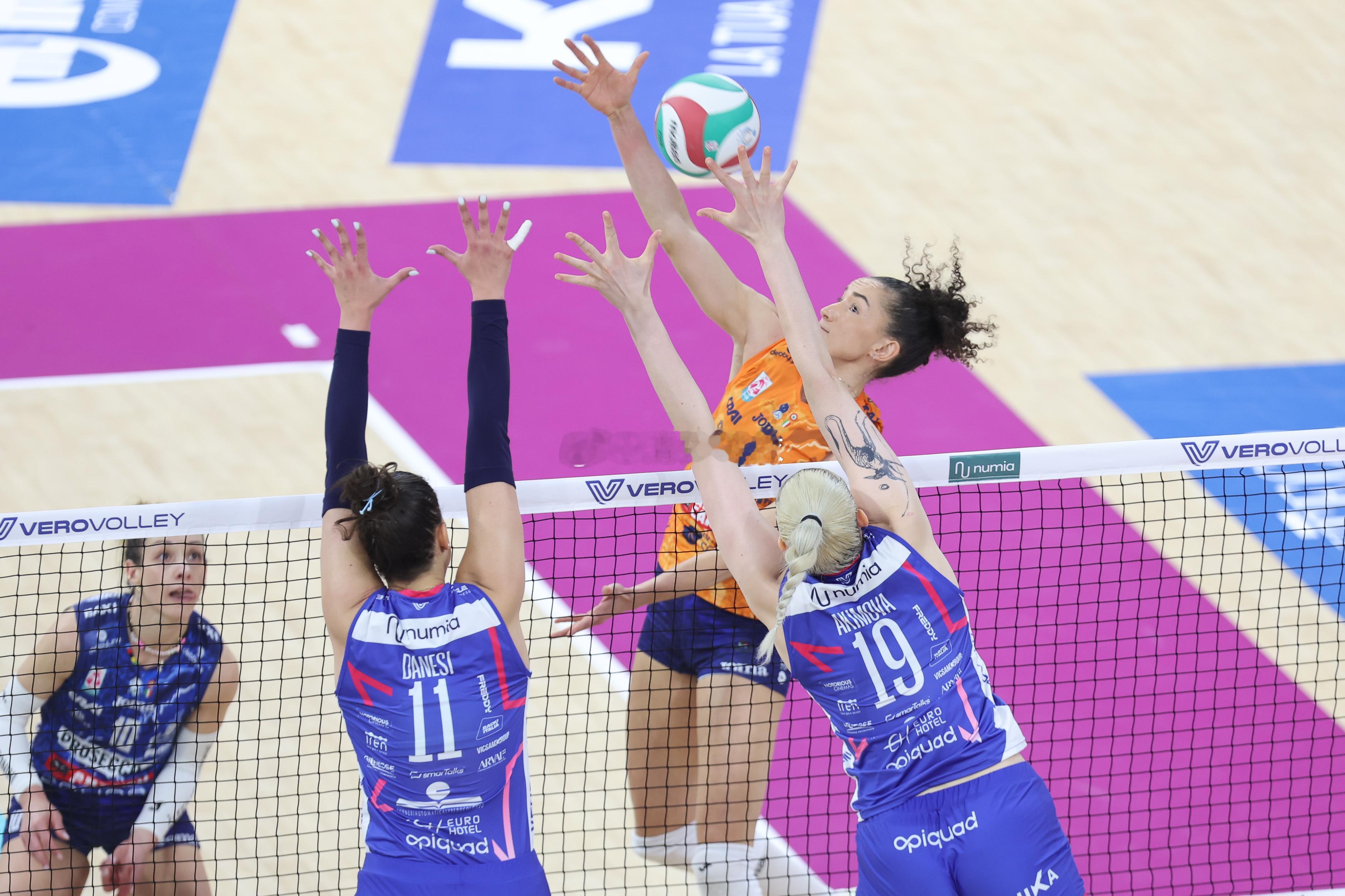 【哈克22分MVP 科内横扫米兰夺冠军场点】2025-2026意大利女排甲级联赛冠亚军决赛第二回合,科内利亚诺女排客场直落三局3-0(25-21 25-19 25-18)横扫米兰女排,在五场三胜制的决赛中科内利亚诺总比分2-0领先米兰拿到冠军场点。哈克22分(29扣18中2失误0被拦、3拦1发)获得本场MVP,朱婷8分(27扣8中2失误1被拦、24次一传0失误、到位率63%),米兰女排接应埃格努15分(41扣14中2失误2被拦、1拦)。