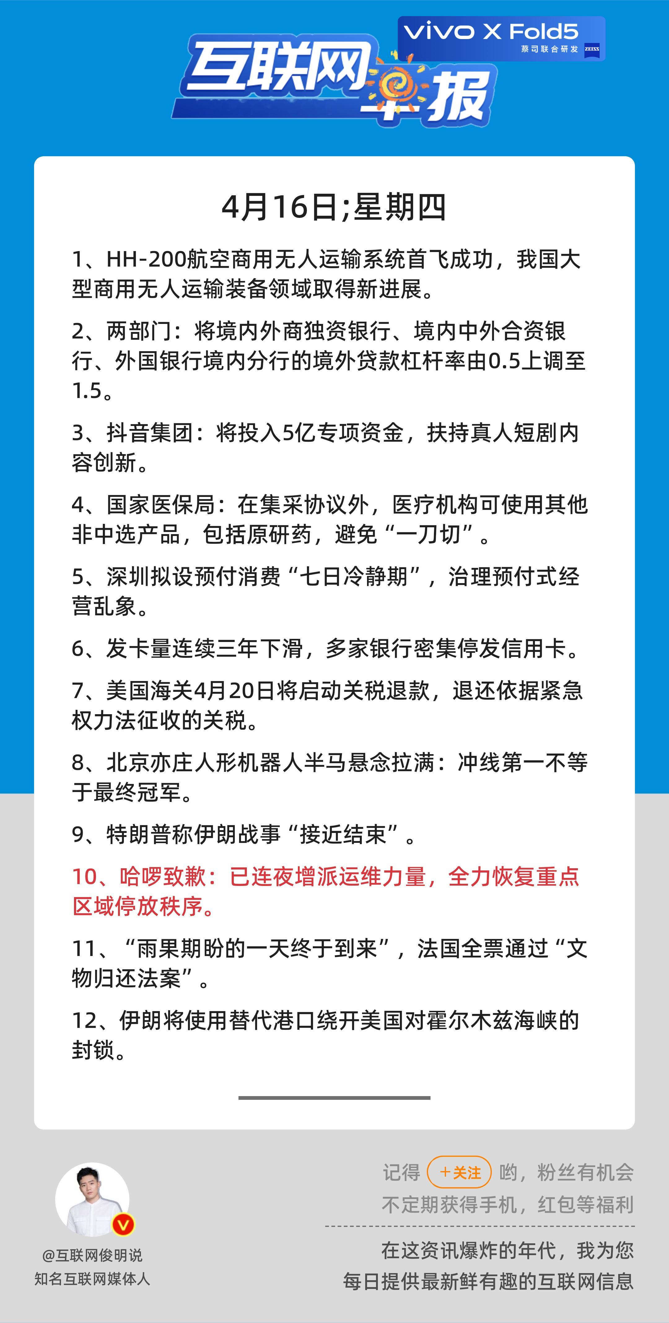 4月16日,星期四,《第3110期》;互联网早报,众览天下事关心第10条:哈啰致歉:已连夜增派运维力量,全力恢复重点区域停放秩序;早安————————————点击右上方关注每天一分钟众览天下事,互联网早报值得拥有! 更多精彩,欢迎加入粉丝群俊明和他的朋友们