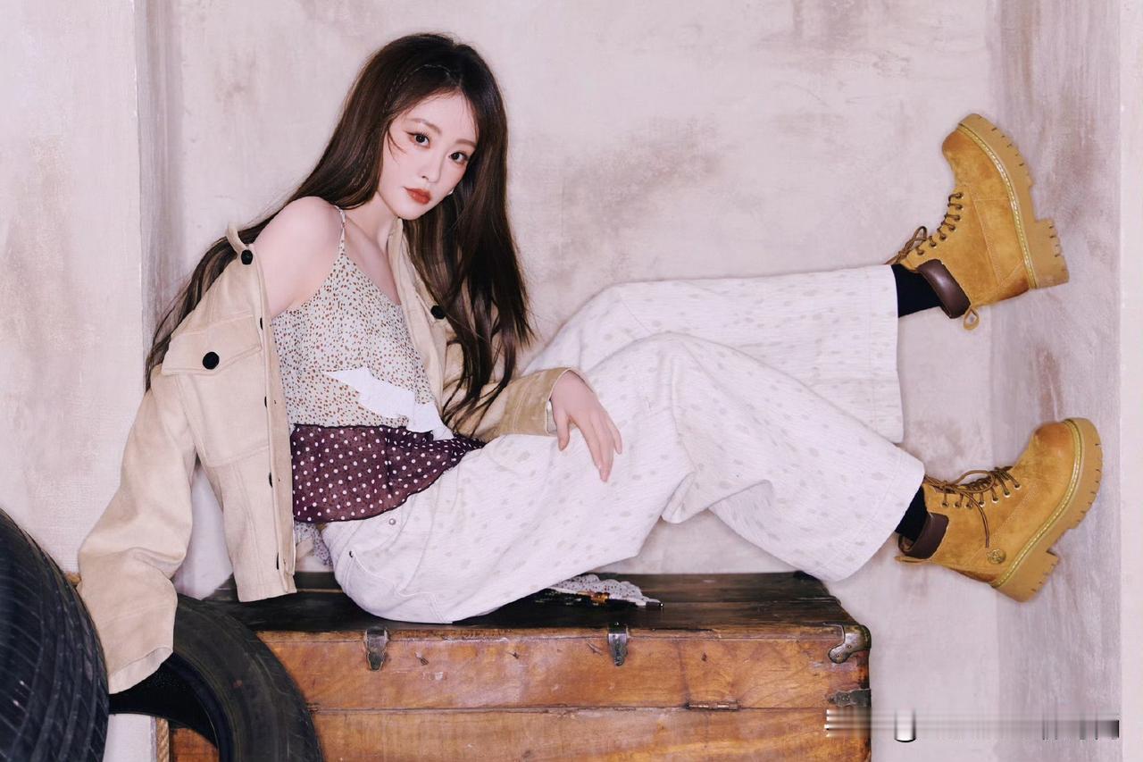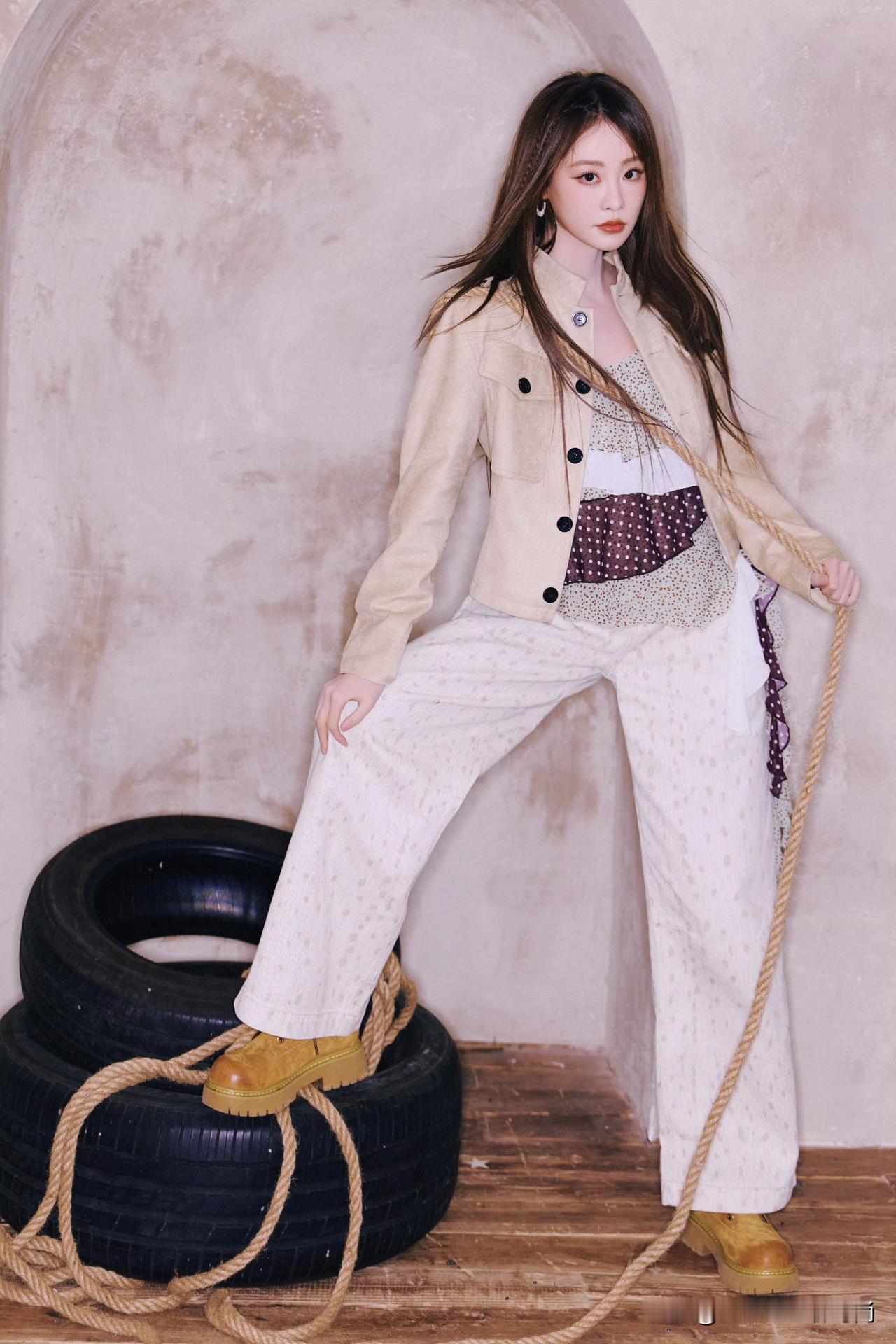 祝绪丹甜酷美式复古风太会穿✨ 祝绪丹这套穿搭把甜酷平衡得刚刚好!卡其色麂皮短外套利落显比例,内搭波点拼接吊带增添柔媚少女感,同色系波点阔腿裤慵懒随性还藏肉。脚踩经典大黄靴拉高气场,颈间挂着的耳机、手中的棒棒糖更是点睛之笔,瞬间拉满复古校园氛围感。整体色调和谐统一,松弛又有个性,胶片质感下甜妹秒变酷飒学姐,太值得借鉴啦!