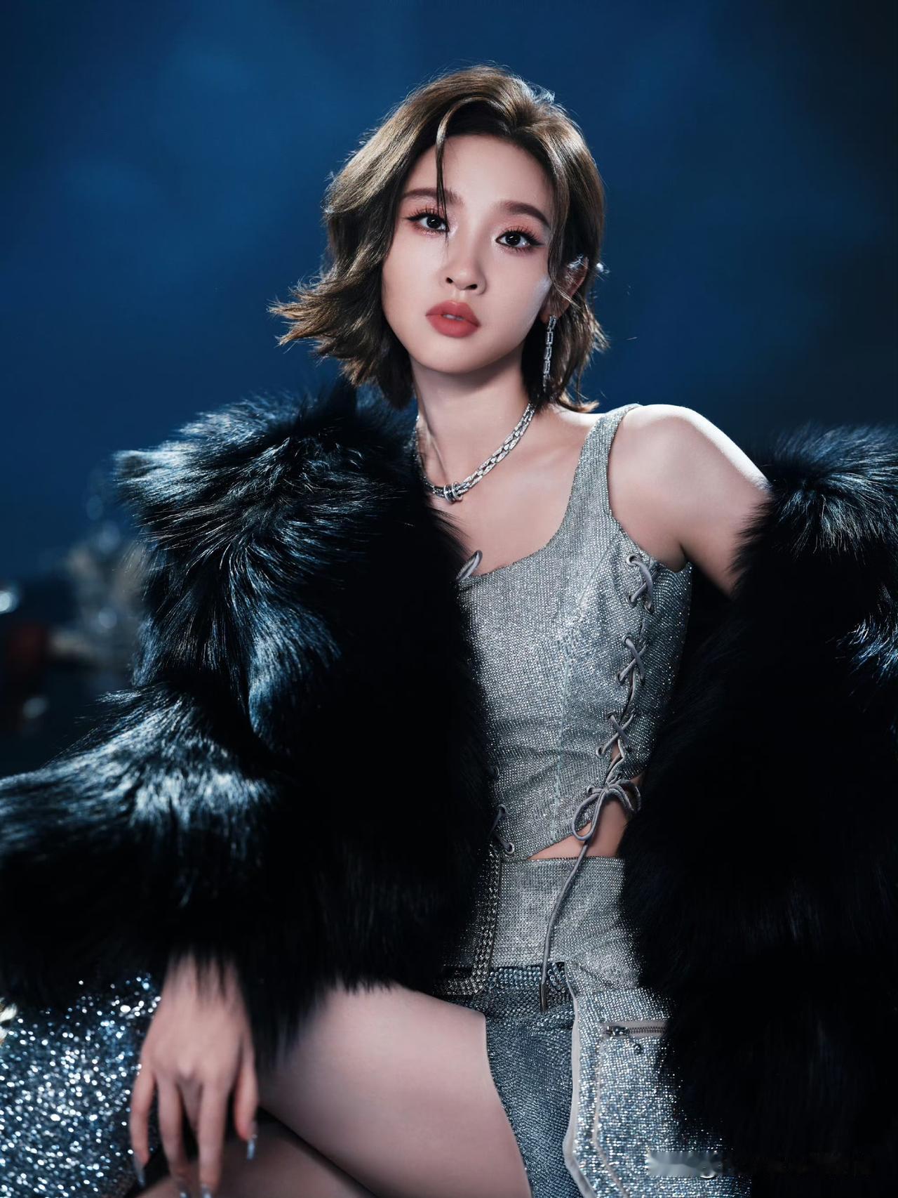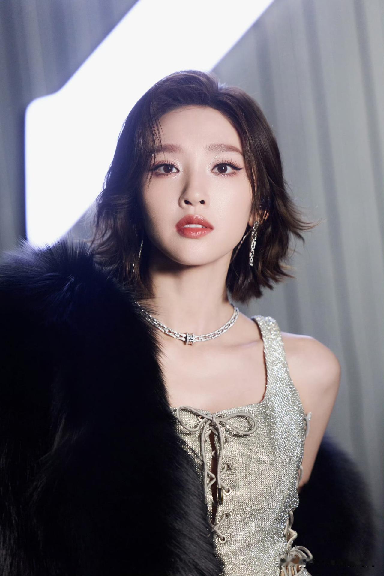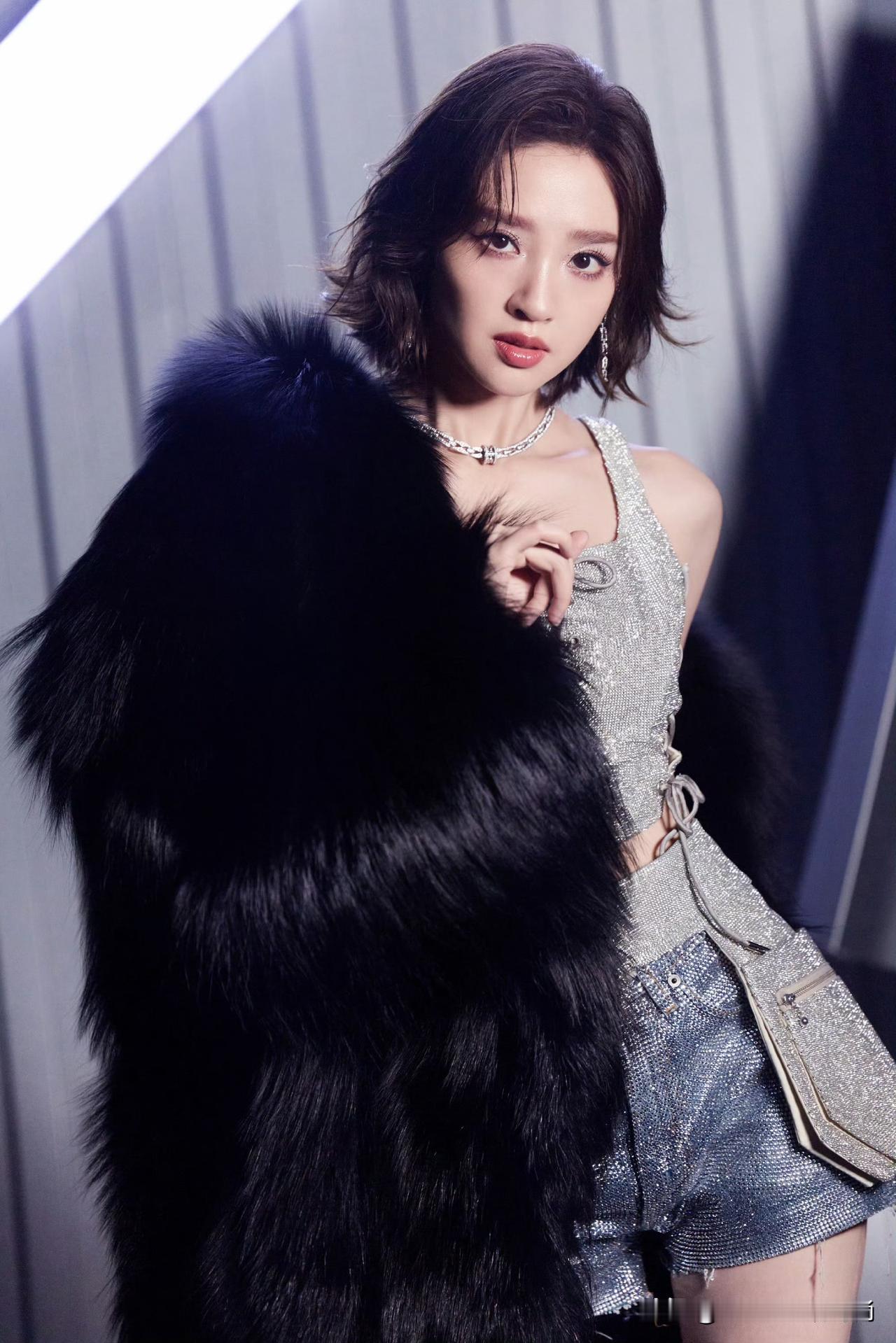唐艺昕甜妹的酷飒反差感太绝了! 银色亮闪绑带吊带搭配同色系短裤,利落露腰设计完美勾勒小蛮腰,辣度直接拉满。外搭黑色毛绒皮草外套,柔暖质感中和露肤感,贵气与野性兼备。 满钻过膝长靴呼应整体亮闪风格,拉长腿部线条,整套造型闪度爆表,又美又野,舞台气场全开!