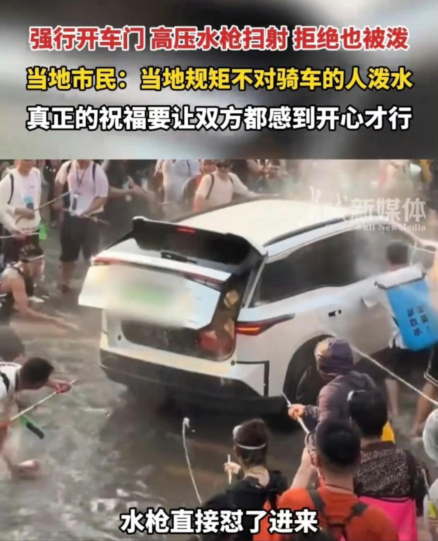 好好好,如果我说车被泼坏了,车辆失控撞出来,那么这下还有什么话说?西双版纳泼水节多人向车内喷水