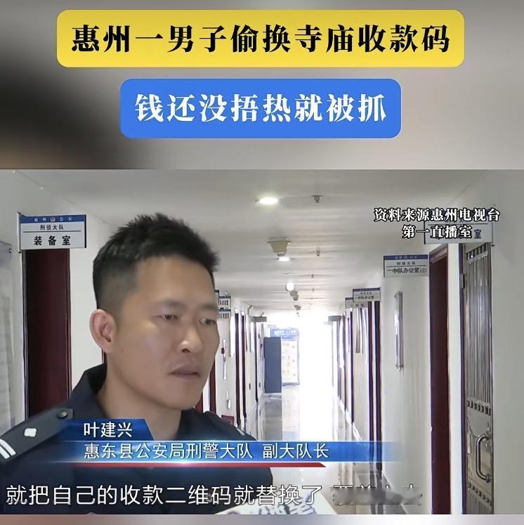 惠州一男子替换寺庙二维码,窃取香火钱。 香客:大师,有替换二维码偷钱! 大师:施主,不用在意,钱材乃身外之物… 香客:他偷换的是贵寺二维码! 大师:我C,在哪?别让他跑了!