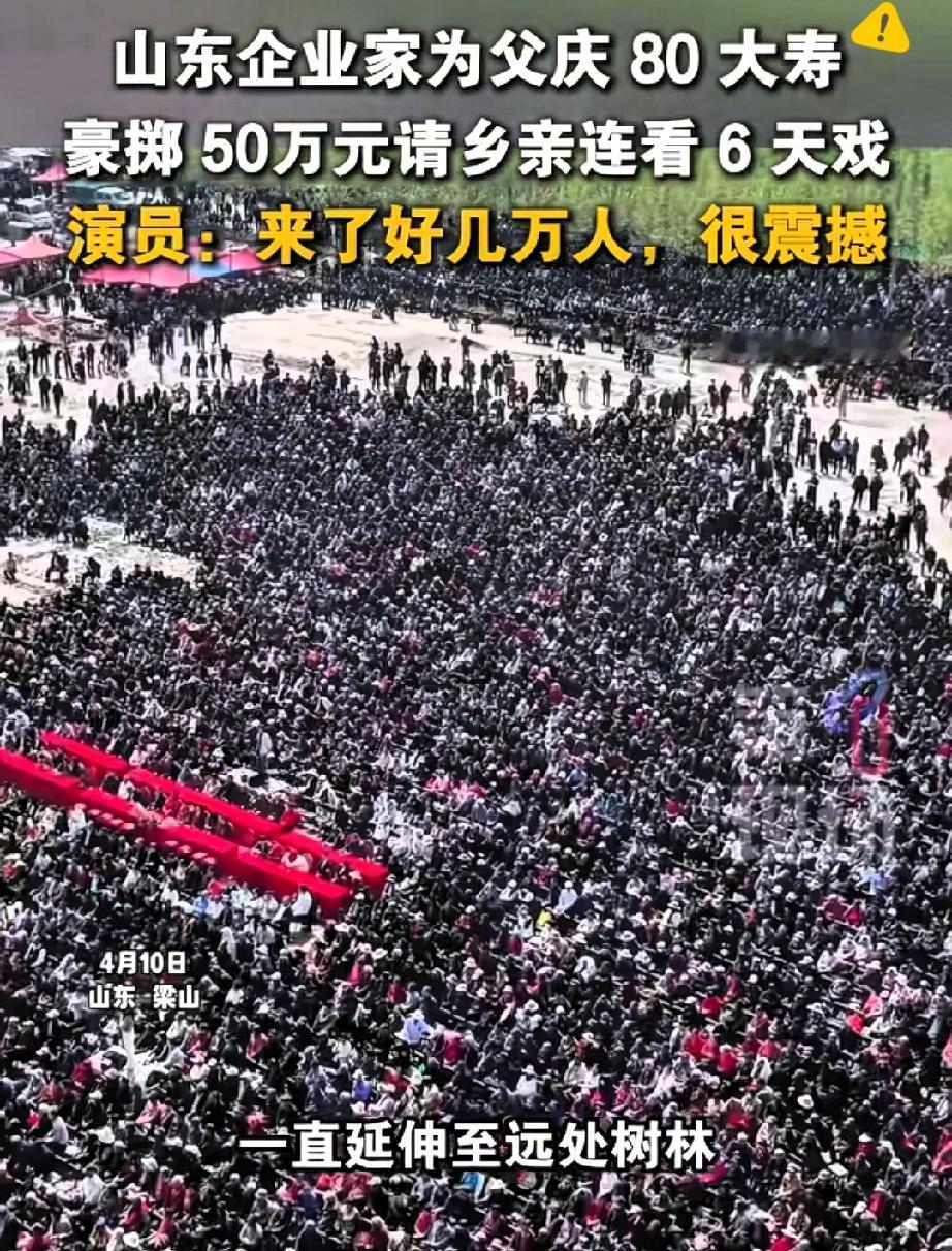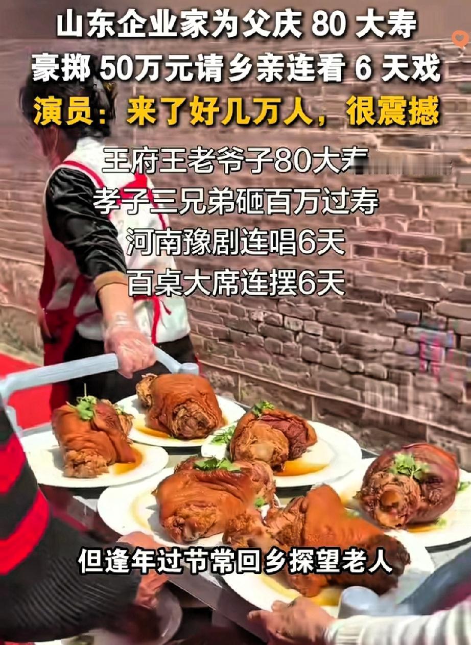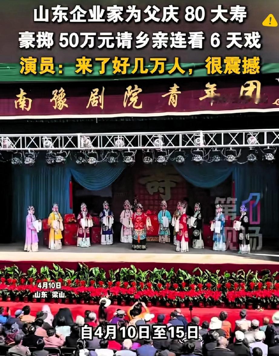 花50万请戏祝寿!这才是真正的孝顺,太让人动容 亿万老板花50万为父庆寿,不摆豪华酒宴不搞排场,专门请来豫剧团连唱6天大戏,这份孝心直接戳中了所有人! 身边人都劝他办奢华寿宴,可他偏偏懂父亲的心意,知道老人独爱豫剧。 这场寿宴,最后变成了全村乃至邻村的戏曲大集,数万乡亲齐聚看戏,现场热闹非凡,他还贴心准备大锅菜,让大家吃饱看好戏。 很多人说这50万花得铺张,可我觉得这才是最顶级的孝顺。真正的孝从不是堆砌物质排场,而是精准满足父母心底的热爱。 比起转瞬即逝的酒宴热闹,这场大戏既圆了父亲的戏瘾,又给全村老人带来了精神慰藉,更守住了骨子里的乡情与本心。 有钱不忘本,孝顺不攀比,这样的孝心远比奢华排场更动人,也让我们看到了乡土里最纯粹的温暖。 你觉得这样的祝寿方式,是不是比豪华宴席更有意义?