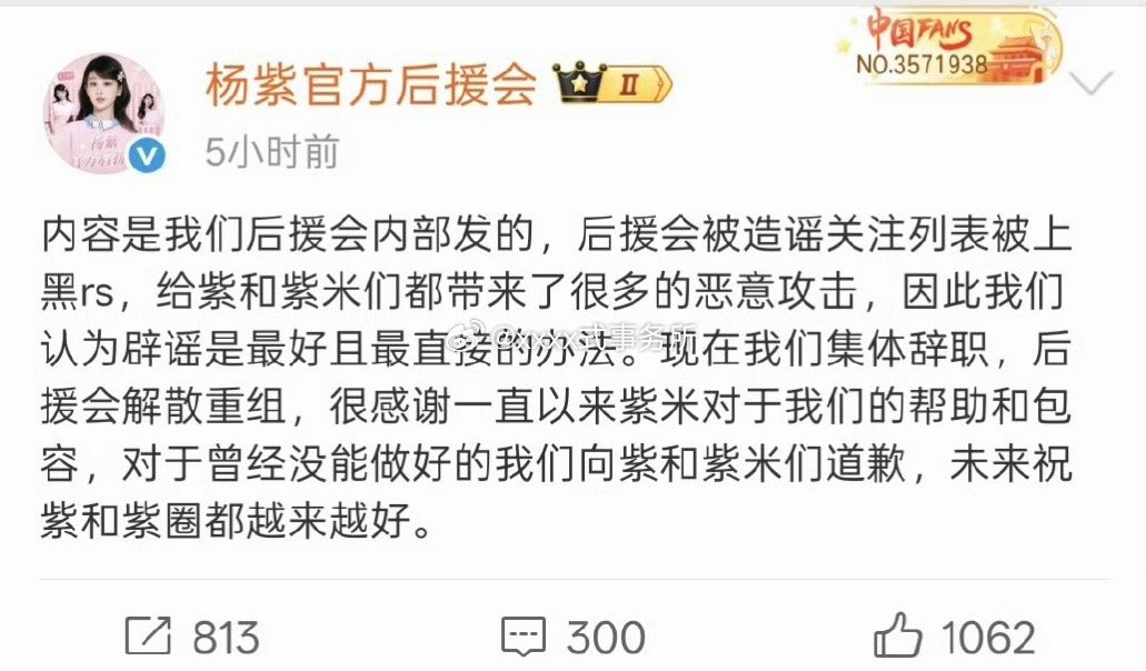 杨紫后援会集体辞职解散重组,表示后援会被zy上了黑热搜,并且给杨紫和紫米道歉了