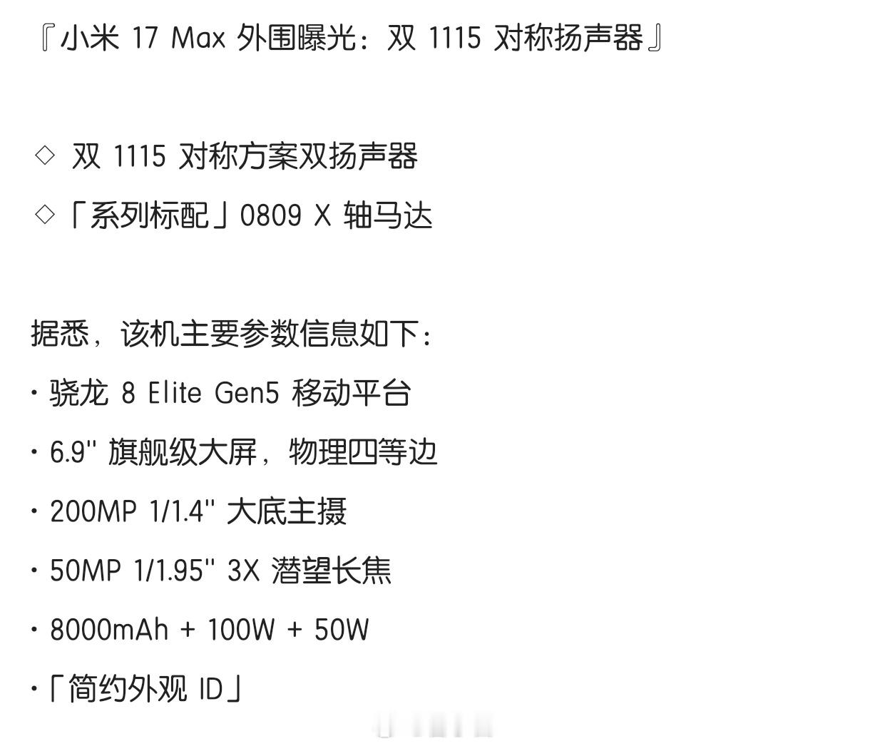 此外,小米17 Max 还将搭载 2 亿像素大底主摄 + 8000mAh±的电池,成为小米史上最大电池手机。