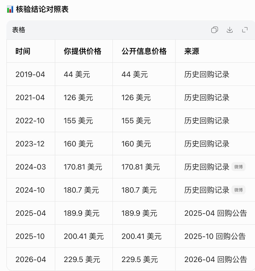 最近几次的回购时间和方案如下:2019年4月,44美元2021年4月,126美元2022年10月,155美元2023年12月,160美元2024年3月,170.81美元2024年10月,180.7美元2025年4月,189.9美元2025年10月,200.41美元2026年4月,229.5美元