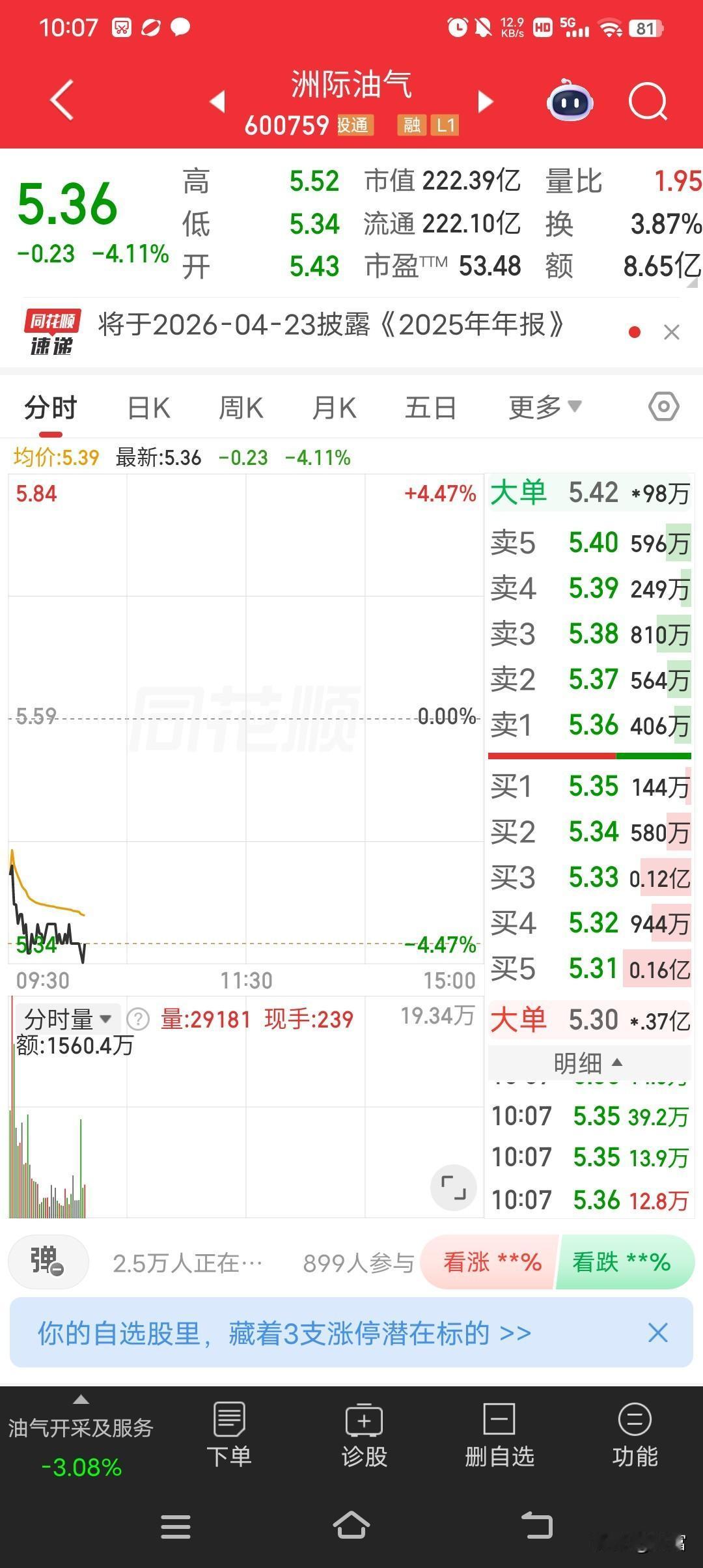 洲际油气最近走势有点弱,最新价5.36元。此前近3个月它从3.12元飙到5.71元,涨幅超83%,但之后就连续回调。4月14日收跌2.78%,收盘价5.59元,技术面看,5、10、20、30日均线呈空头排列,趋势明显偏弱,上方5.70元、5.85元构成强压力,下方5.30元、5.00元形成关键支撑。 资金面上,当日成交额24.87亿元,主力资金小幅净流出1.23亿元,做多意愿不足。虽说实体加油站油价上涨,但洲际油气受国际油价高位回落等因素影响,明日上涨概率仅42%,大概率弱势震荡寻支撑,难有强势上攻行情。