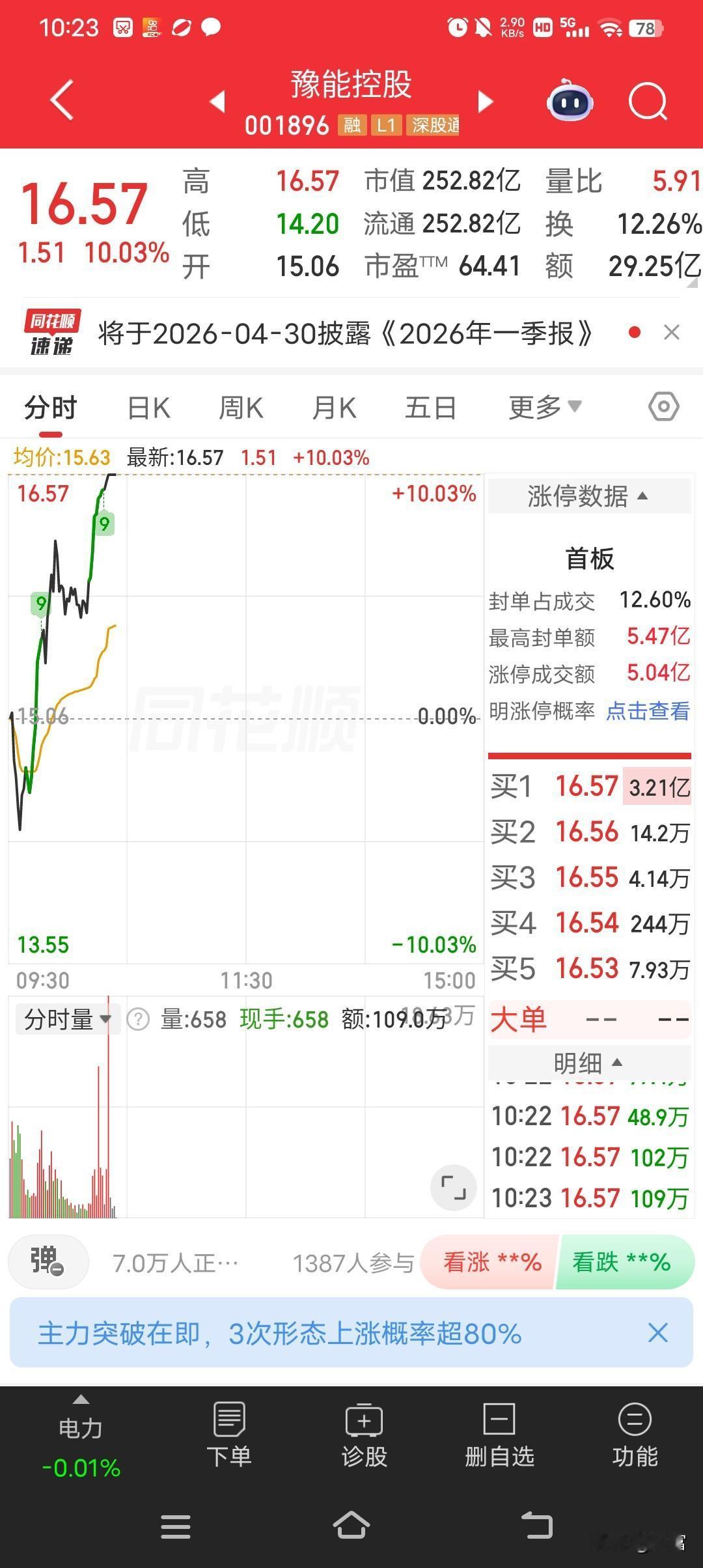 豫能控股这走势简直太猛了,不愧是电力龙头!从7元一路涨到16.57,这涨幅太惊人。2月27日电力板块再度走强,豫能控股7连板,带着赣能股份、华银电力等小弟一起涨。 2026年3月27日它又涨停,最新价16.54元,较昨收涨了9.97%。当日成交量226.46万手,交易很活跃。它主营发电业务,火力发电及热力生产和供应占比超90%。这业绩加上强劲走势,未来说不定还能继续创造惊喜,值得持续关注。