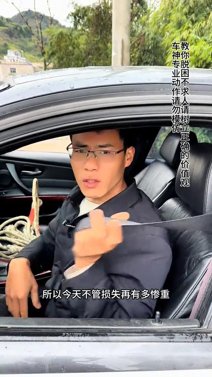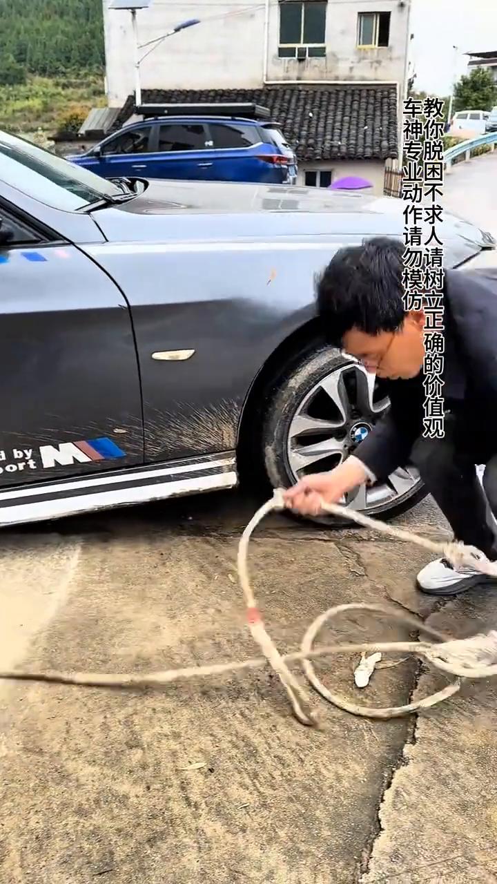 汽车一招脱困不求人。 先看汽车两个后轮同时掉下路坎,这种情况很多人都会加油往前面开,想跑门都没有。这个时候会发现汽车根本就开不上来。这种情况很多人都会花钱去找吊车找救援,搞的钱像大风刮来的一样。所以今天不管损失再有多惨重,都要把脱困技能拍出来供大家观看,以后遇到这种情况就再也不用花钱去请救援了。 其实两个后轮掉下路坎脱困非常的简单,只需要一个人就行了。 ·只需要准备两条拖车绳,一条拖车绳就开始绑在后轮上,从这里伸进去,然后从洞口掏出来。掏出来之后特别重要的绑法就是把短的这一条绳子从底下绕过来,这样子穿进去。这种绑法教了很多遍,很多人看视频的时候都觉得自己会了,但是真正实操的时候就不会了。 ·前轮绑的也特别的简单,只需要从前轮的后面甩进去,这样子再把它抓紧,往这边再拉紧,这里再甩进去。另外一条绳子就绑另外一边,跟着镜头过来看。 ·这边也是从这个位置穿进去,然后掏出来。大家注意看了,这个位置有气嘴,要把它避开,就绑在下面的洞口穿过来,照样从这里穿进去。拉到前面来,这里一定要注意了,给它留下来一点,然后这一头甩进去,拉紧,再甩进去。 接下来上车,拭目以待,见证奇迹的时候就开始了。挂上前进挡,然后慢慢的加油往前面开。仔细看好了,绳子已经绷紧了,这个时候再慢慢的加油,汽车慢慢的就上来了。这不就很轻松就脱困了吗? 学会了的朋友赶紧点个免费的关注,交个懂车的朋友。