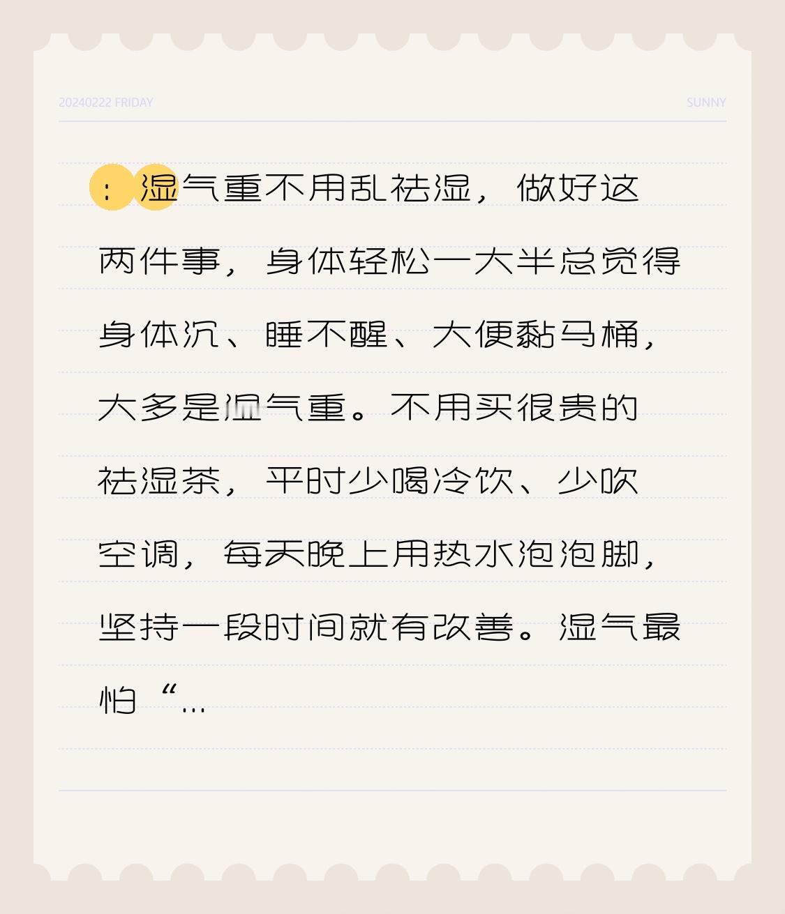 :湿气重不用乱祛湿,做好这两件事,身体轻松一大半 总觉得身体沉、睡不醒、大便黏马桶,大多是湿气重。 不用买很贵的祛湿茶,平时少喝冷饮、少吹空调, 每天晚上用热水泡泡脚,坚持一段时间就有改善。 湿气最怕“温”,身体暖起来,自然就轻松了。 你有没有湿气重的困扰?