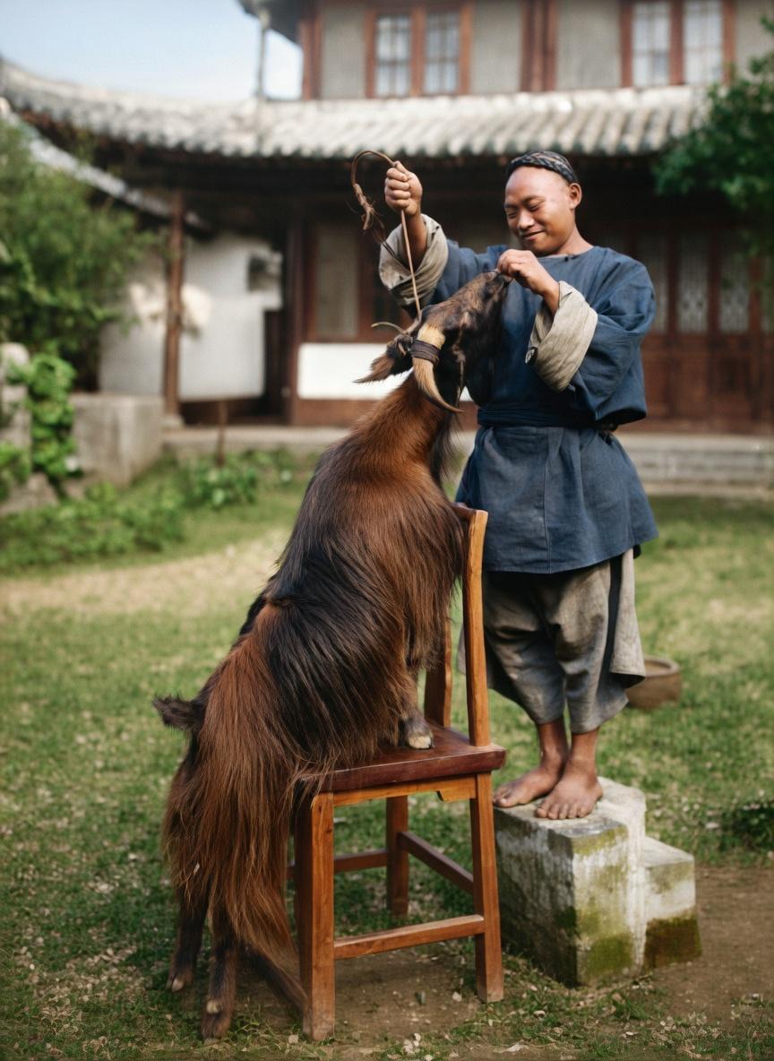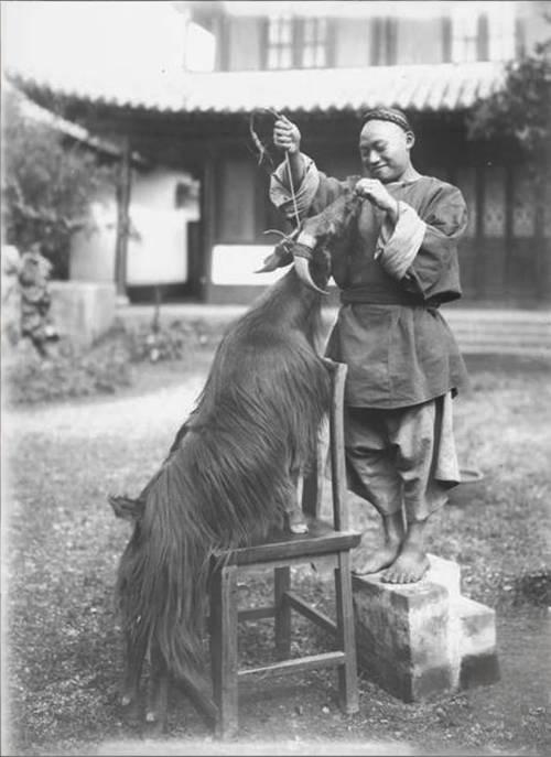 清末,一处中式庭院内,一底层街头艺人赤着双脚站在石墩上,将长辫盘绕在头顶;身着粗布短打上衣,挽起袖口、腰系布带,下搭宽松裤装,一手牵绳控制山羊,一手辅助调整,神情专注,正进行驯羊表演的训练。 男子身前是一只长毛绒山羊,前蹄踩在木椅上,呈现出表演姿态。这类长毛山羊是清末杂耍艺人的常用表演品种,经过训练可完成“上椅、作揖、走步”等简单技艺,是艺人走街串巷卖艺的核心“饭碗”。 清末社会动荡、民生凋敝,大量底层百姓失去稳定生计,驯兽杂耍成为走街串巷的江湖艺人的核心谋生方式。艺人带着训练好的动物在集市、街巷表演,向围观观众收取微薄赏钱,以此换取温饱。