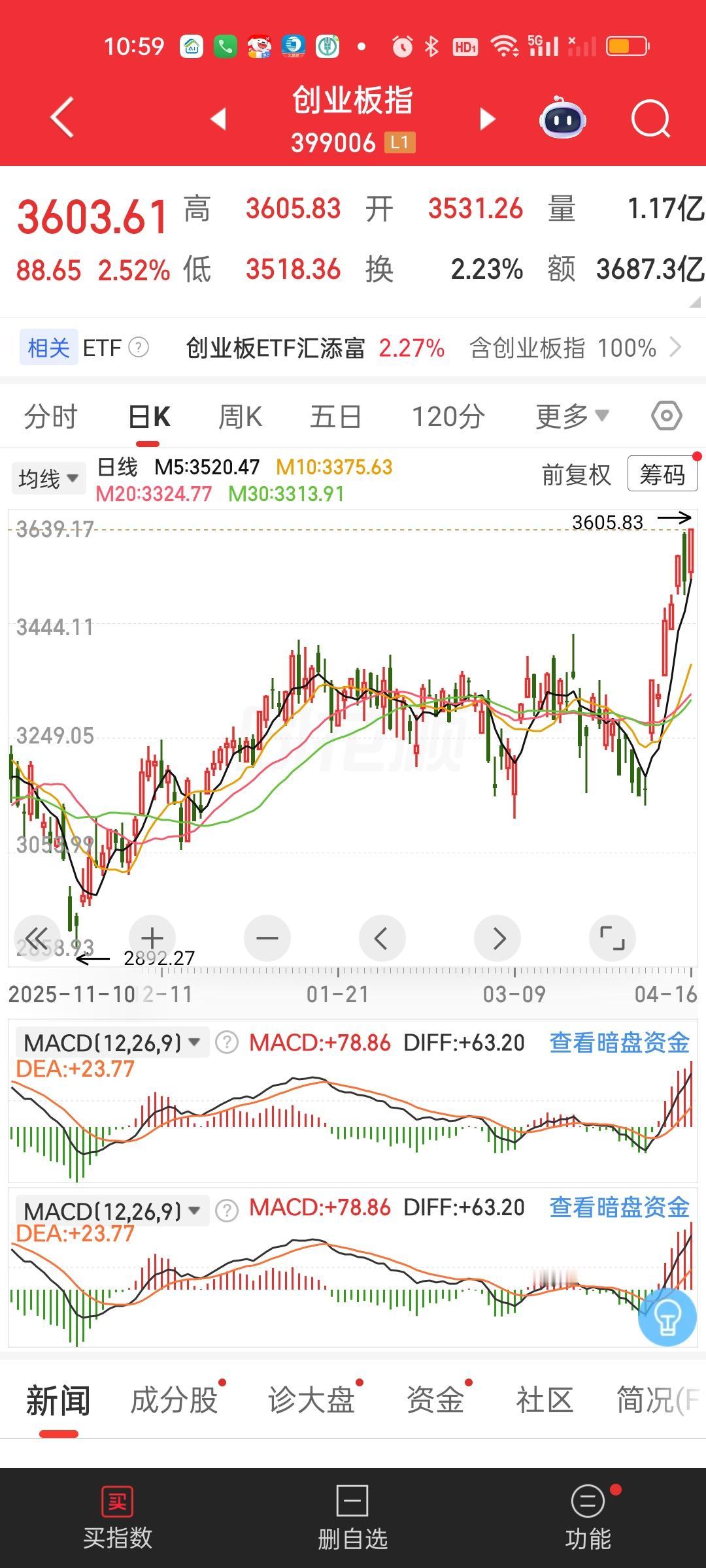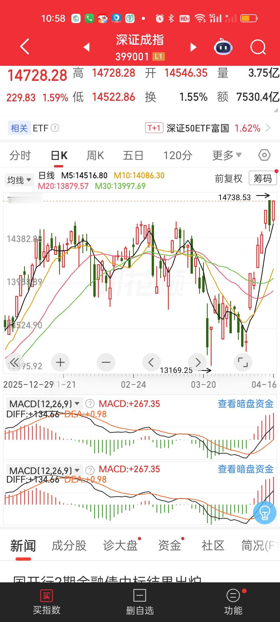都已经到这个节骨眼了,气氛都烘托到这里了,不蒸馒头也要争口气啊。别被外人看笑话。全球股市都在暴涨,都在创新高。你不能一直装作看不见吧?怎么样也要表示一下啊! 现在创业板指已经创出10年来的新高(不是历史新高),其它指数也要跟上对吧?可放眼望去,其它指数别说历史新高,距离前高都差的老远。一声叹息啊!现在就看深圳成指的了,因为只有它距离新高最近。只差10个点。那今天继创业板指之后大概率还可以创一个新高出来。