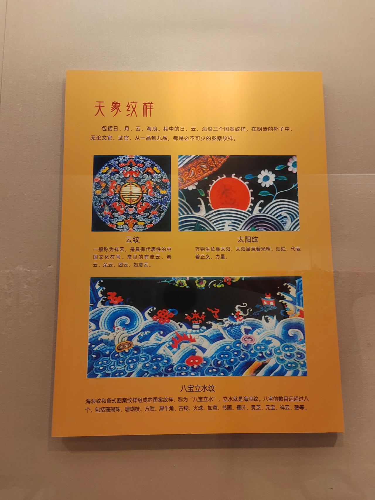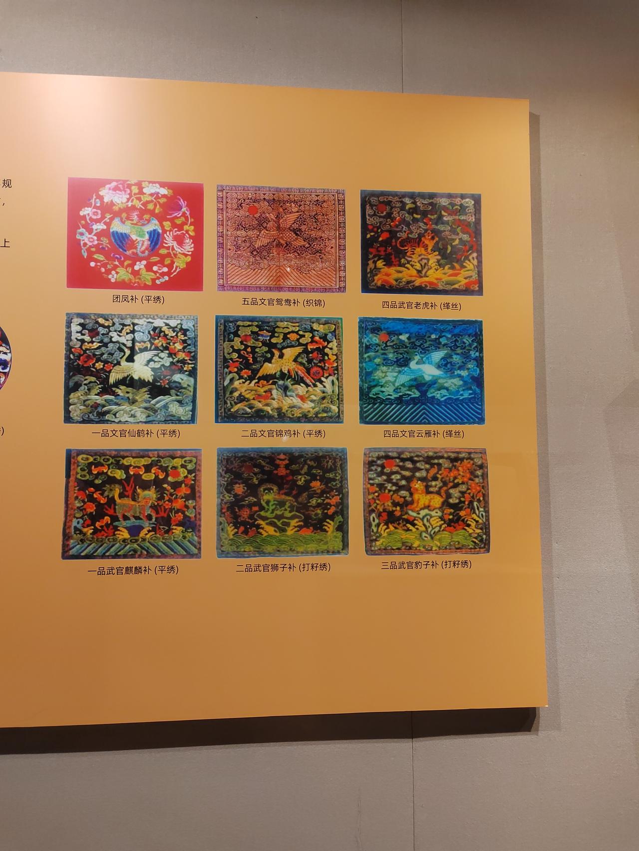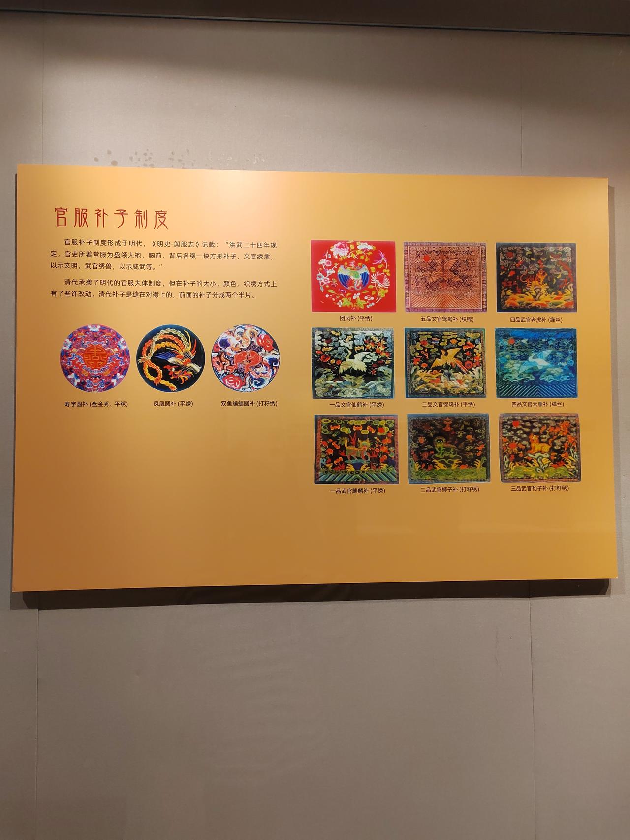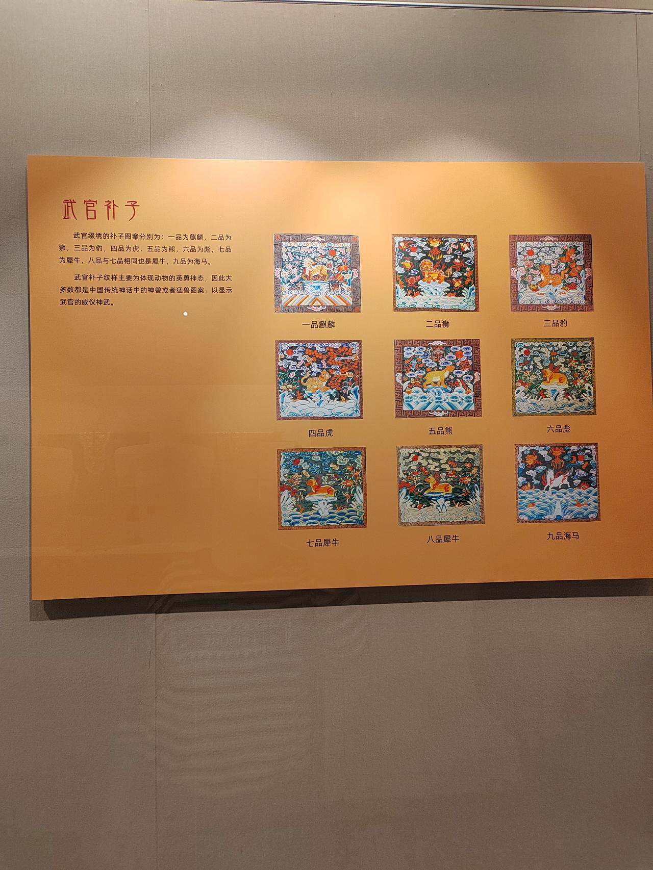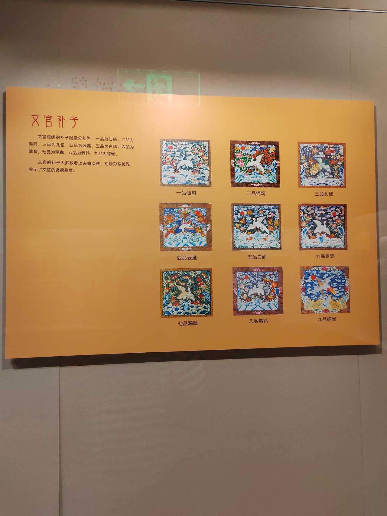 文官绣禽,武官绣兽。中华文化的博大精深体现在生活的方方面面,连衣服上的图样都寓意深刻。从随处可见的植物到天象纹样,均包含着人们对美好生活的向往。 不仅民间如此,官I场上更有明示。自唐代武则天时期,衣服上的图案便开始确定官员的品级,动物图案是不能随便绣在衣服上的。 古代官服, 文官绣禽,以示文明;武官绣兽,以示I威武。 这些是展示在嘉定博物馆里的服饰。在漫长的岁月里, 有太多我们不了解的内容,如果有空就多去博物馆里转转吧。 有人说过,每一页历史,都是前人智慧的结晶,照亮未来的道路。