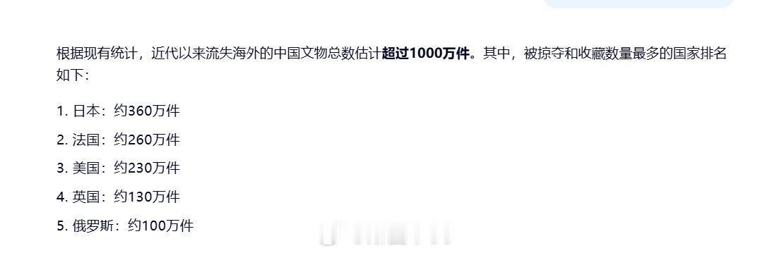 文物返还法国的做法值得日本学习近代以来流失海外的中国文物总数估计超过1000万件。其中,被掠夺和收藏数量最多的国家日本:约360万件法国:约260万件美国:约230万件英国:约130万件俄罗斯:约100万件