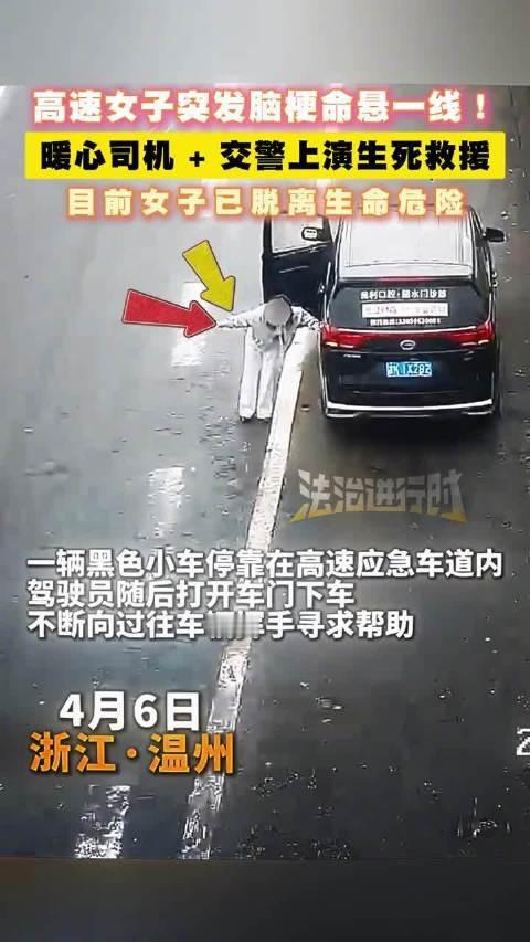 高速突发脑梗,挥手求救的她,如何赢得这场生死接力赛? 4月6日,在G1513温丽高速公路往丽水方向梅岙出口附近,一名驾驶黑色商务车的女子在突发脑梗后,强忍不适将车停入应急车道并打开双闪,随后踉跄下车向过往车辆挥手求救。这一危急情况被温州公安交警高速公路三大队视频巡查时发现,警方立即调度附近警力与施救力量前往。与此同时,路过的白色小车司机刘师傅主动停车相助,他发现女子面色惨白、双手抽搐,便迅速报警并将女子扶至副驾驶座,驾车驶向最近的梅岙收费站。 一场生命的接力就此高效展开。交警已提前联动120急救中心,急救人员在收费站等候。刘师傅抵达后,与施救人员一起握着女子的手反复揉搓,帮助其保持意识,并不停安抚“不要紧张,120马上到了!”辅警朱红涛则通过电话联系上女子家属。急救车赶到后,众人合力将女子送医。因送医及时,经诊断该女子为突发脑梗,目前已无大碍。警方提醒,高速行车如感身体不适,应尽快驶入服务区或下高速,若无法继续驾驶,须将车停于应急车道,做好安全警示后立即拨打12122报警求助。 脑梗死急救 头晕脑梗