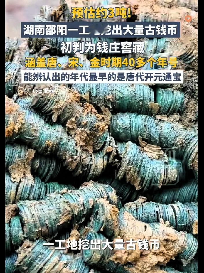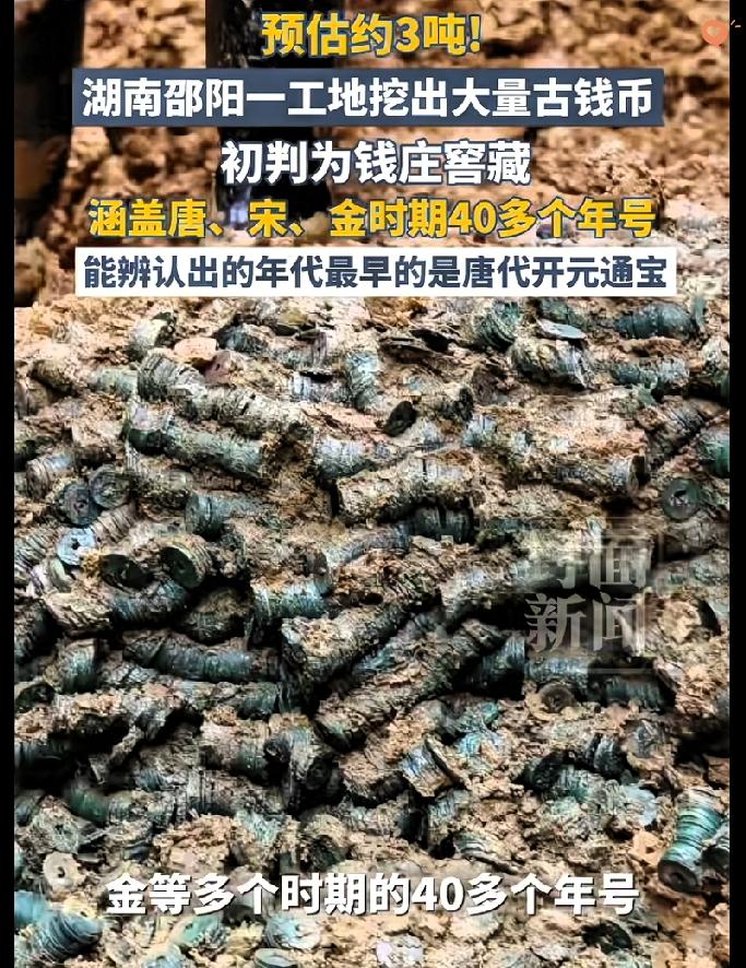 工地一铲挖出3吨古钱!这才是藏在地下的城市底气 施工挖管网竟意外掘出古代钱庄金库,3吨古钱币横跨唐宋金四十多个年号,这场意外发掘,直接揭开了武冈千年繁华的秘密。 文物专家火速到场封存清理,从开元通宝到绍定通宝品相完好,足以印证这里自古便是商贸重地。 地下沉睡的钱币重见天日,不仅是罕见的考古发现,更是城市历史最鲜活的物证。 比起冰冷的申报材料,这些历经岁月的古钱更有分量,为武冈申创历史文化名城添上了硬核一笔。 地下藏的从来不只是财富,更是一座城的文脉与底蕴。 你见过这么震撼的地下文物发现吗?