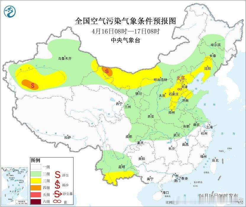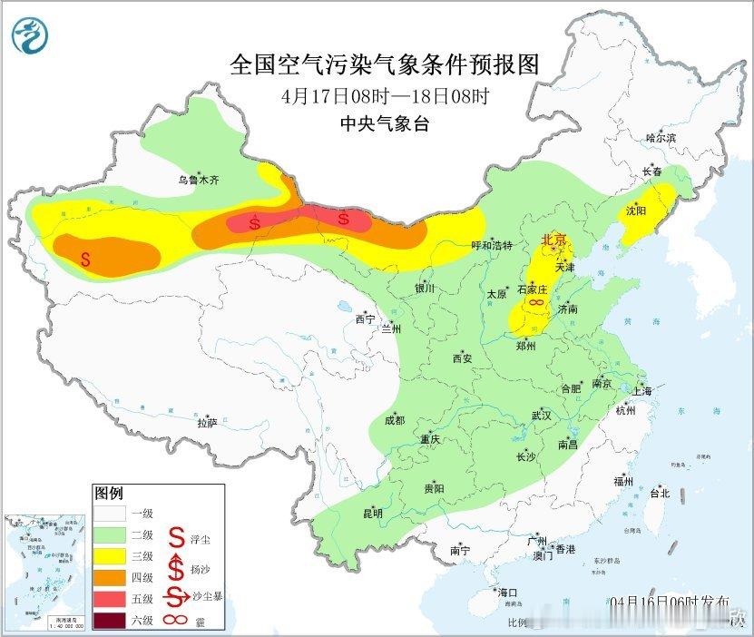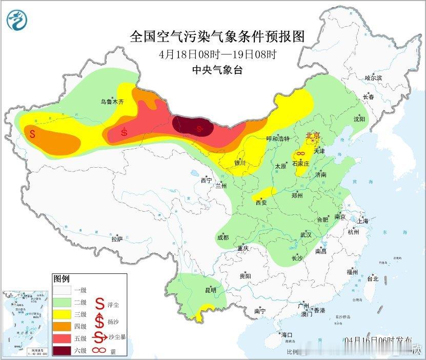 16日-17日辽宁以及16日至18日京津冀一带可能还有轻微的霾。16日在内蒙古西部,17日至19日,新疆东部和南部、青海西北部、内蒙古中西部、甘肃中西部、宁夏、陕西北部等地自西向东有扬沙或浮尘天气,其中新疆东部、内蒙古西部局地有沙尘暴。