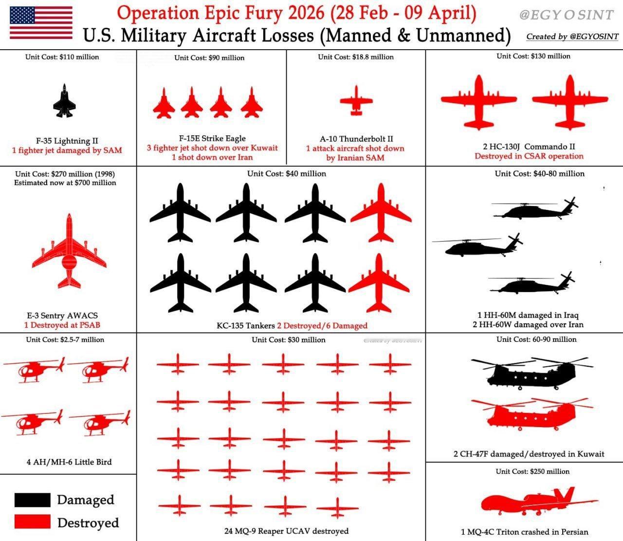 美国空军在伊朗战争—“史诗狂怒行动”中的损失最新情况(2026年4月9日):