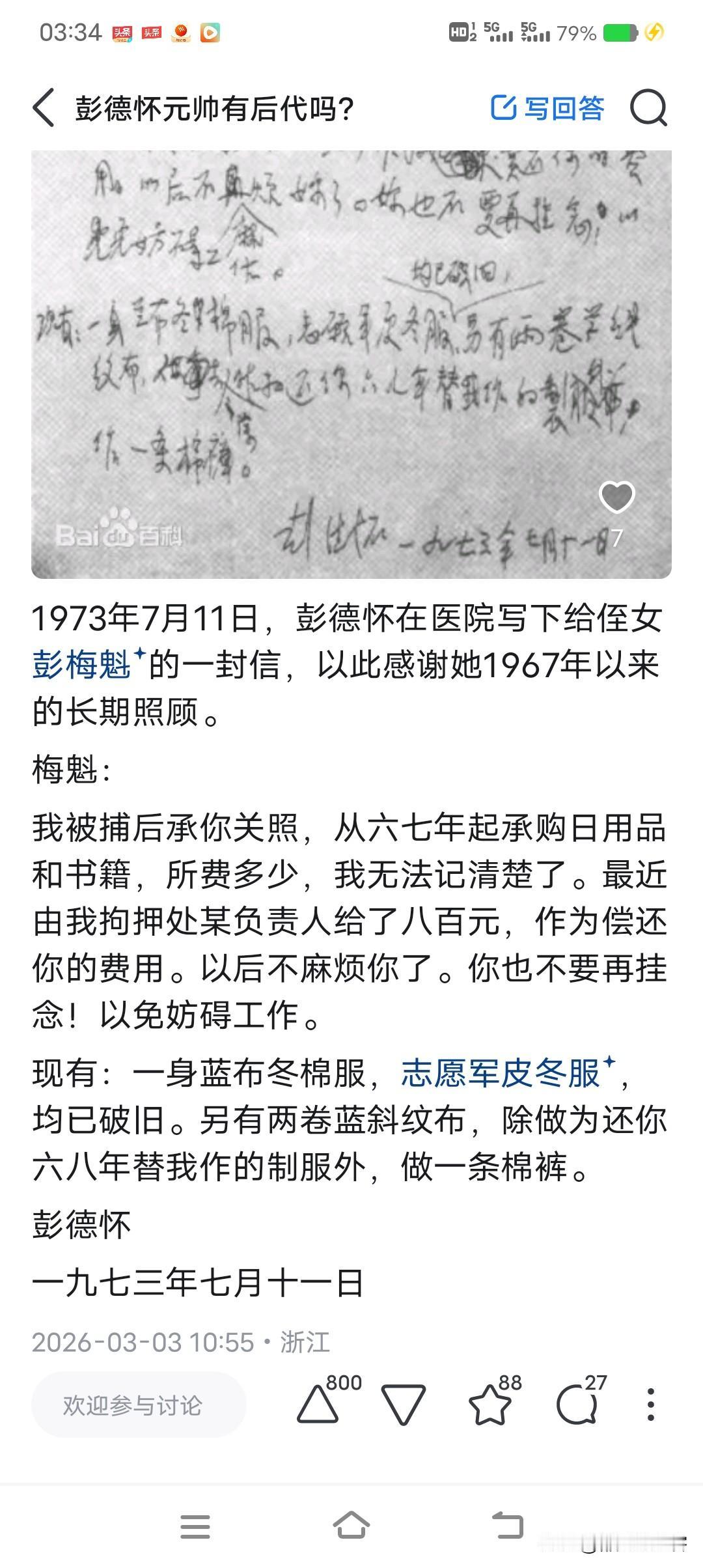 这是1973年7月11日,彭德怀在医院写下给侄女彭梅魁的信,感谢她在1967年以来的长期照顾! 信的内容是:梅魁:我被捕后承你关照,从六七年起承购日用品和书籍,所费多少,我无法记清楚了。最近由我拘押处某负责人给了八百元,作为偿还你的费用。以后不麻烦你了。你也不要再挂念,以免妨碍工作! 现在一身蓝布冬棉服,志愿里皮冬服!均己破旧,另有两卷蓝斜纹布,除做为还你六八年替我做的制服外,做一条棉裤! 彭德怀,一九七三年七月十一日! 彭老总字里行间中,总是替她人着想,话语中的无奈,以及不想再麻烦侄女啦,仅有的钱,仅有的衣裳,都给了侄女! 这也是对她多年照顾的感谢,以及对侄女的挂念! 彭老总一生坦坦荡荡,仗义执言,抗战时期,赫赫战功,名存青史!毛主席曾高度评价彭老总:谁敢横刀立马,唯我彭大将军!