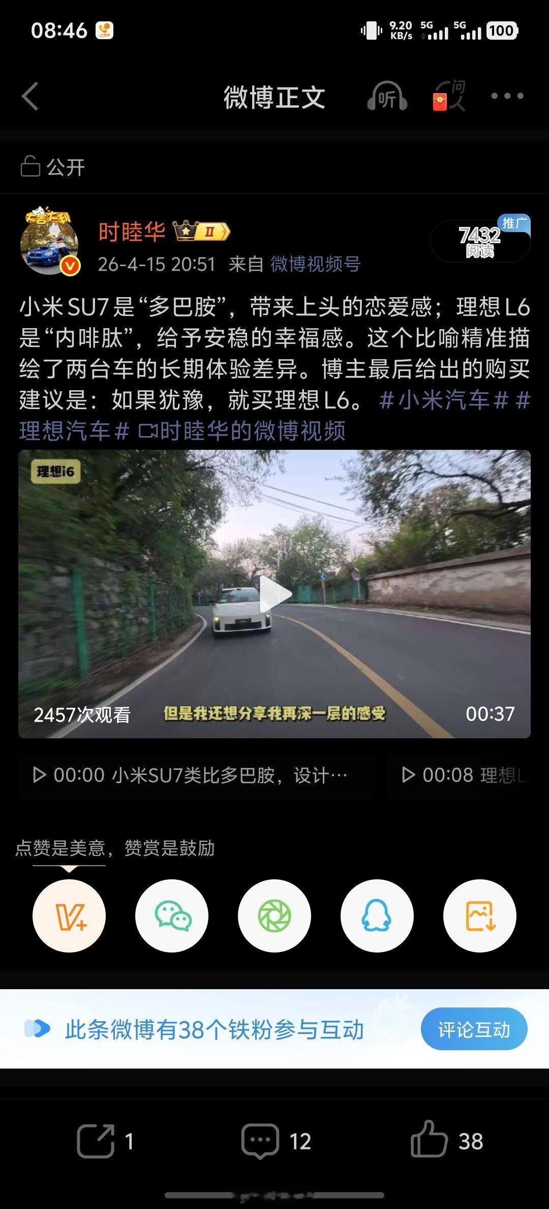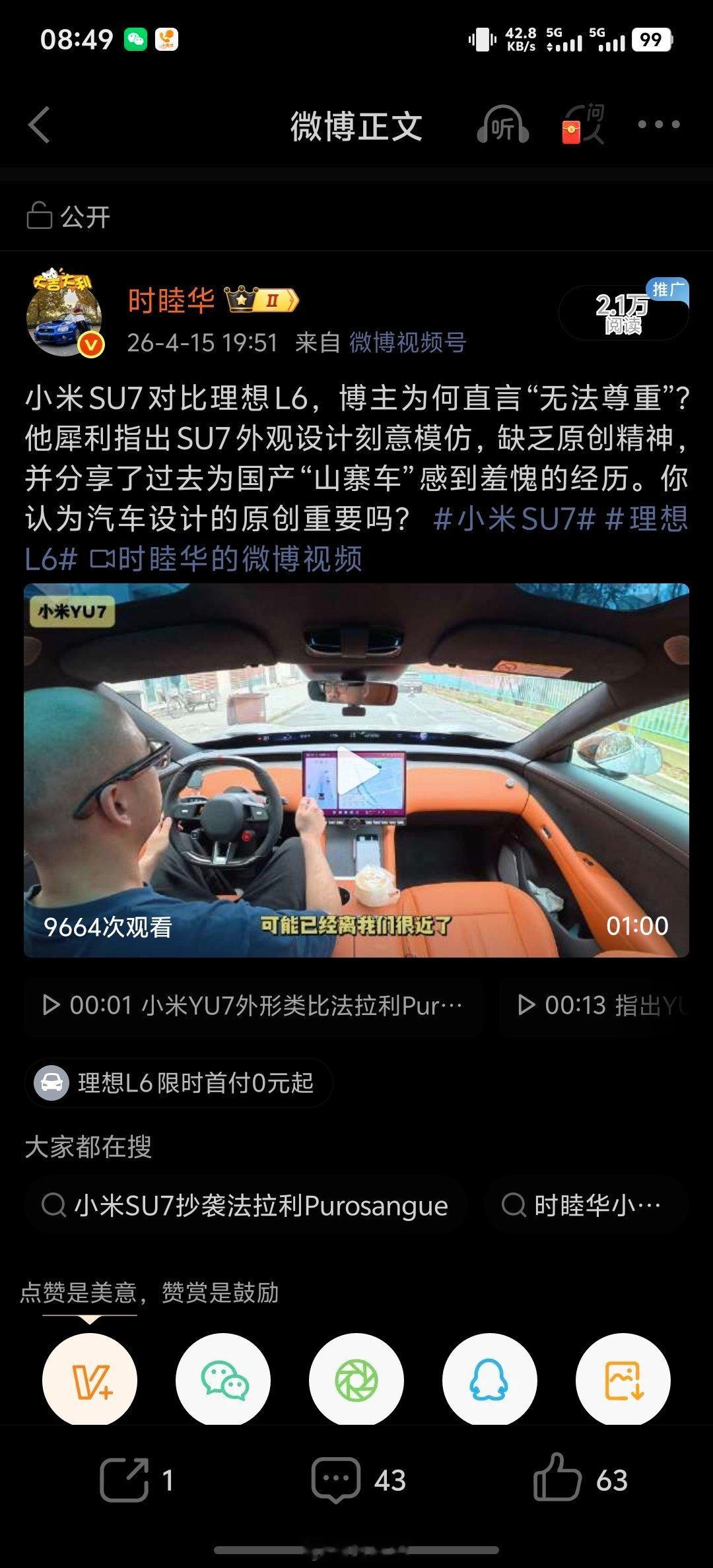 微博这个AI自动总结、自动切片、自动发布的功能,以后不能再用了。把片子里的YU7写成SU7,i6写成L6。被网友骂完了。