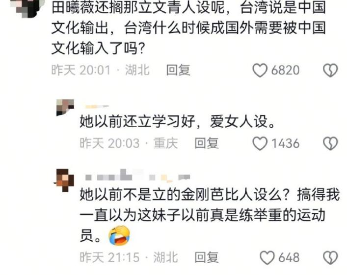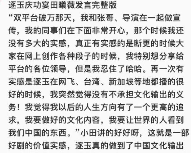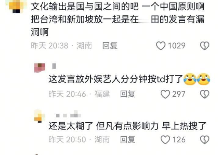 再一次感受到文艺工作者要有文化这句话的含金量。 足浴剧组顶着官媒批评,数据注水等丑闻的风头下,依旧开了庆功宴。 那庆的是什么功,是庆祝成功给世界抹黑了中国军人吗? 是成功洗白屠城、洗白水淹百姓吗? 两位男女主的发言更是狂妄自大。 一个说是给中国长剧带来了希望,一个说承担起了文化输出的义务。 拜托!说这些话之前能不能看看大众的反应,而不是圈地自萌。 这就是现在的文艺工作者吗? 只说在自己的圈子吗? 男主狂妄自大,女主的发言也是毫无顾忌。 什么叫,网飞、新加坡台湾都播很好的时候。 新加坡与台湾地位是一样的吗? 台湾是中国不可分割的一部分,不是一个独立国家,也不是外国。 “文化输出”这个词,默认是国与国之间的文化传播,用在台湾身上,等于在法理和语境上把台湾当成“外国”,会造成事实上的“一中一台”错误表述。 所以说,文艺工作者还是有文化,即便没有文化,在发声前能不能让经纪人审一下稿子。 年轻的文艺工作者们,请好好补补文化课吧,别再丢人现眼了。