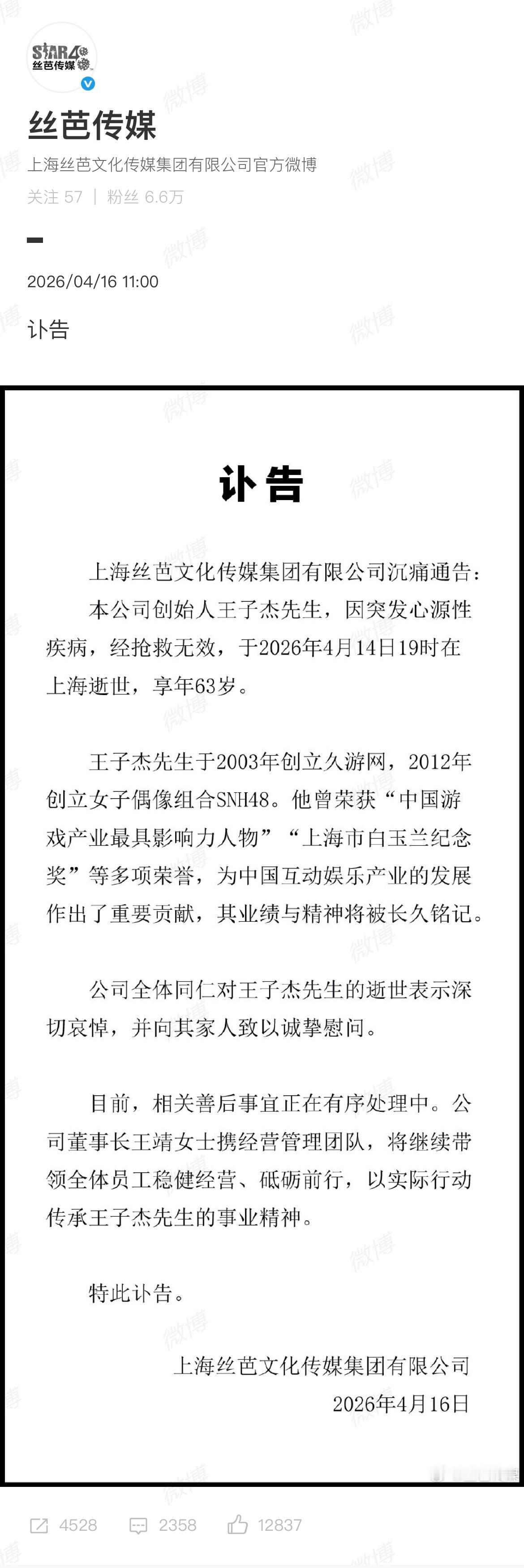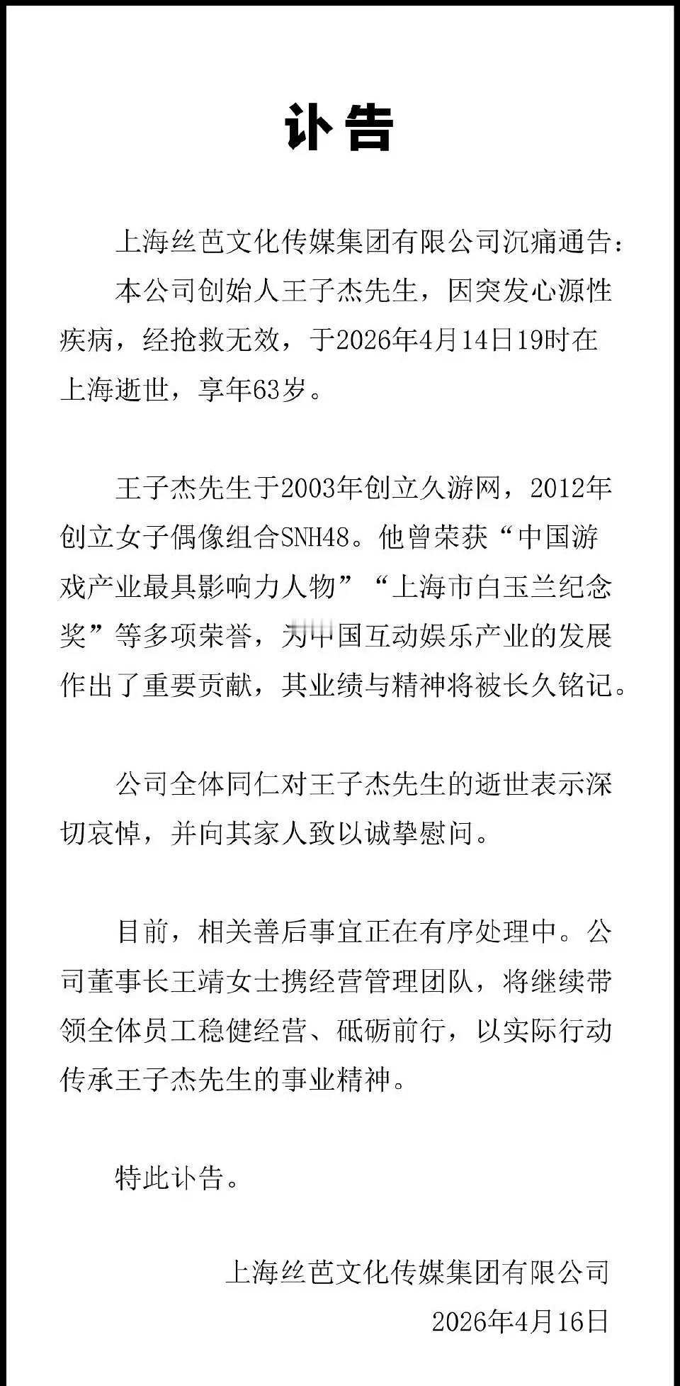 丝芭总裁王子杰去世 丝芭传媒发讣告:王子杰抢救无效逝世