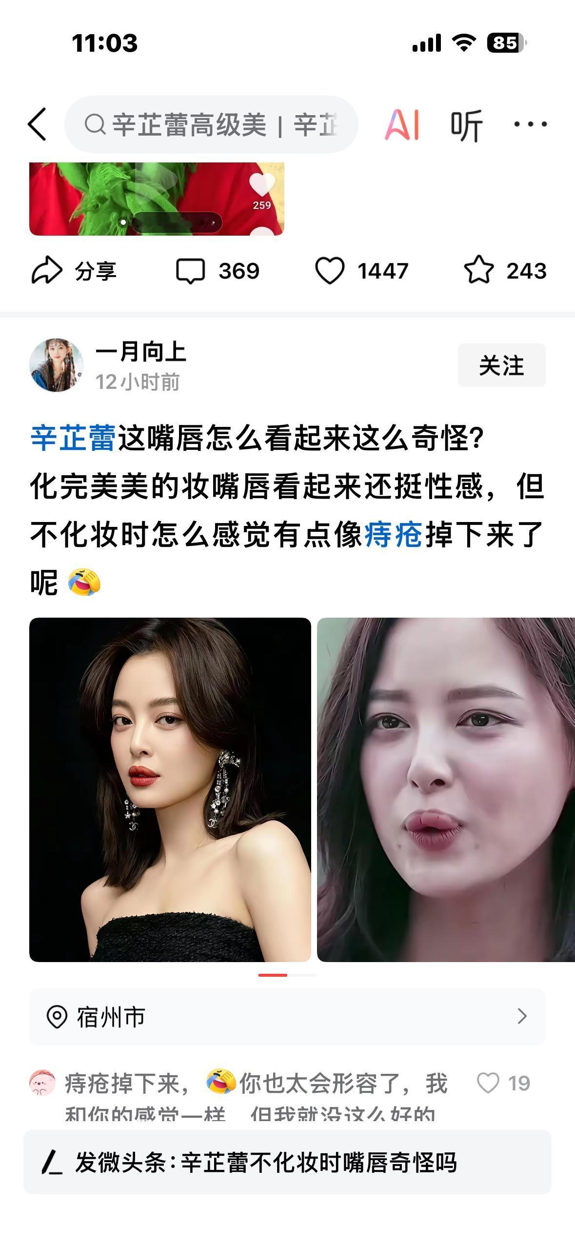 辛芷蕾不化妆时嘴唇奇怪吗她的嘴唇确实与众不同,虽没觉得有人说的那么性感,却也没觉得难看,但这个网友把她比喻成痔疮脱落很不礼貌,不管对谁你都不该这么比喻她,把嘴唇比肛门痔疮是侮辱人太不合适!