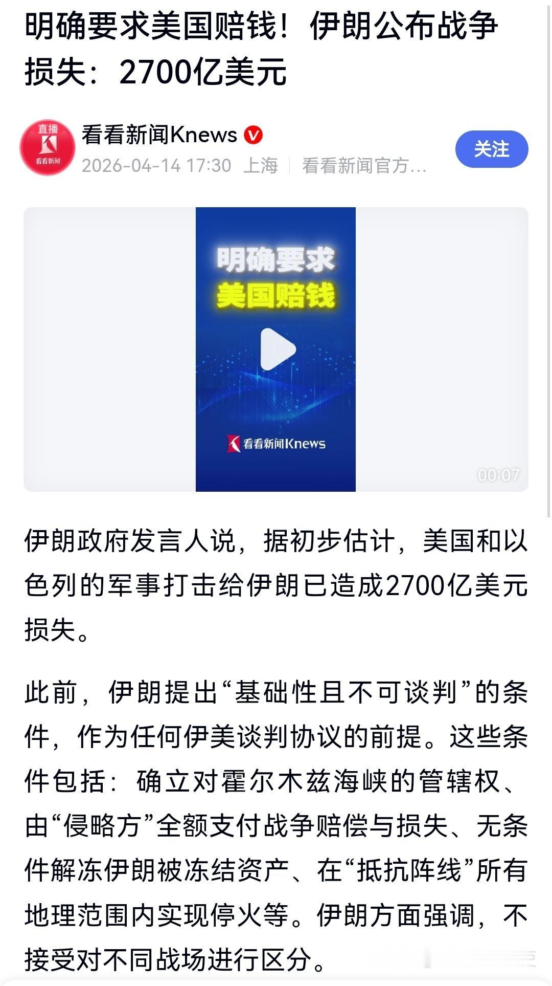 美国会向伊朗赔这2700亿美元吗? 无非就三种可能,全赔,一点不赔或者部分赔偿。 全赔是不可能的。 如果是全赔,那意味着要特朗普承认发动战争是错误的,责任全在美国自己。这种情况下,特朗普不挨美国人喷死才怪,他宣扬“美国赢麻了”的观点会瞬间坍塌,连他的MAGA基本盘都会唾弃他。 一点不赔也是不可能的。 这种情况倒是符合特朗普商人出身的做事风格,在他眼里,美国都打赢战争了,干嘛要赔钱给输家?这和做生意赢家通吃的道理不是一样的嘛? 但一点都不赔可能会让伊朗完全没有面子,会逼着伊朗走向破罐子破摔的地步,谈判也不谈了,就和你美国打到底,到时候国际能源价格肯定快速飙升,最后导致美国通涨厉害,民众怨声载道,共和党中期选举彻底没戏,特朗普当然不希望这样的事情发生。 部分赔偿才是最有可能。 这个方案既能让伊朗有台阶下,又能让特朗普不太担心国内的反对意见。当然了叙事方面双方各有不同,伊朗方面会说“又取得一个伟大胜利”,美国方面会说“对伊朗进行人道主义援助”。 只不过,这赔的钱,特朗普是肯定不会直接从美国腰包里面掏出来,结果估计要么是从伊朗被冻结的海外资产里面出,要么是让中东王爷们一起凑个数。