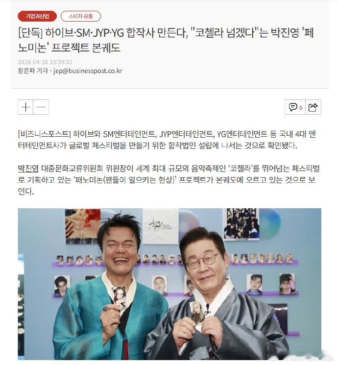 韩国四大经纪公司考虑合开公司 据韩媒,HYBE、SM、JYP、YG等韩国4大娱乐公司为了打造全球庆典,正在成立合作公司。 大众文化交流委员会委员长朴振英计划举办能超越世界最大规模音乐节“科切拉”的庆典“Fanomenon”。