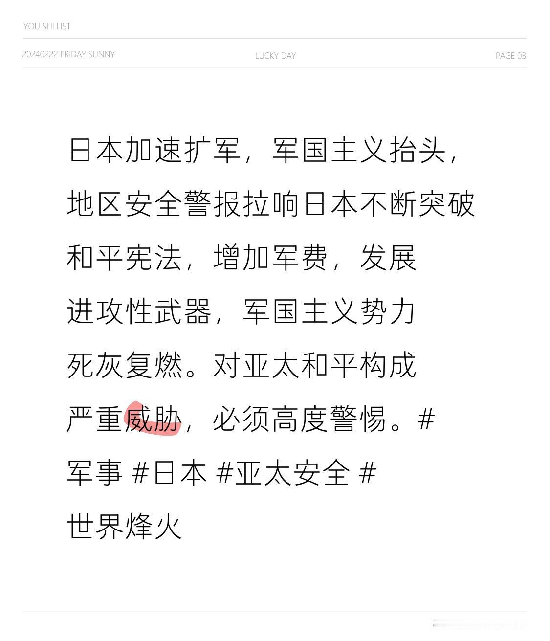 日本加速扩军,军国主义抬头,地区安全警报拉响 日本不断突破和平宪法,增加军费,发展进攻性武器,军国主义势力死灰复燃。对亚太和平构成严重威胁,必须高度警惕。 军事 日本 亚太安全