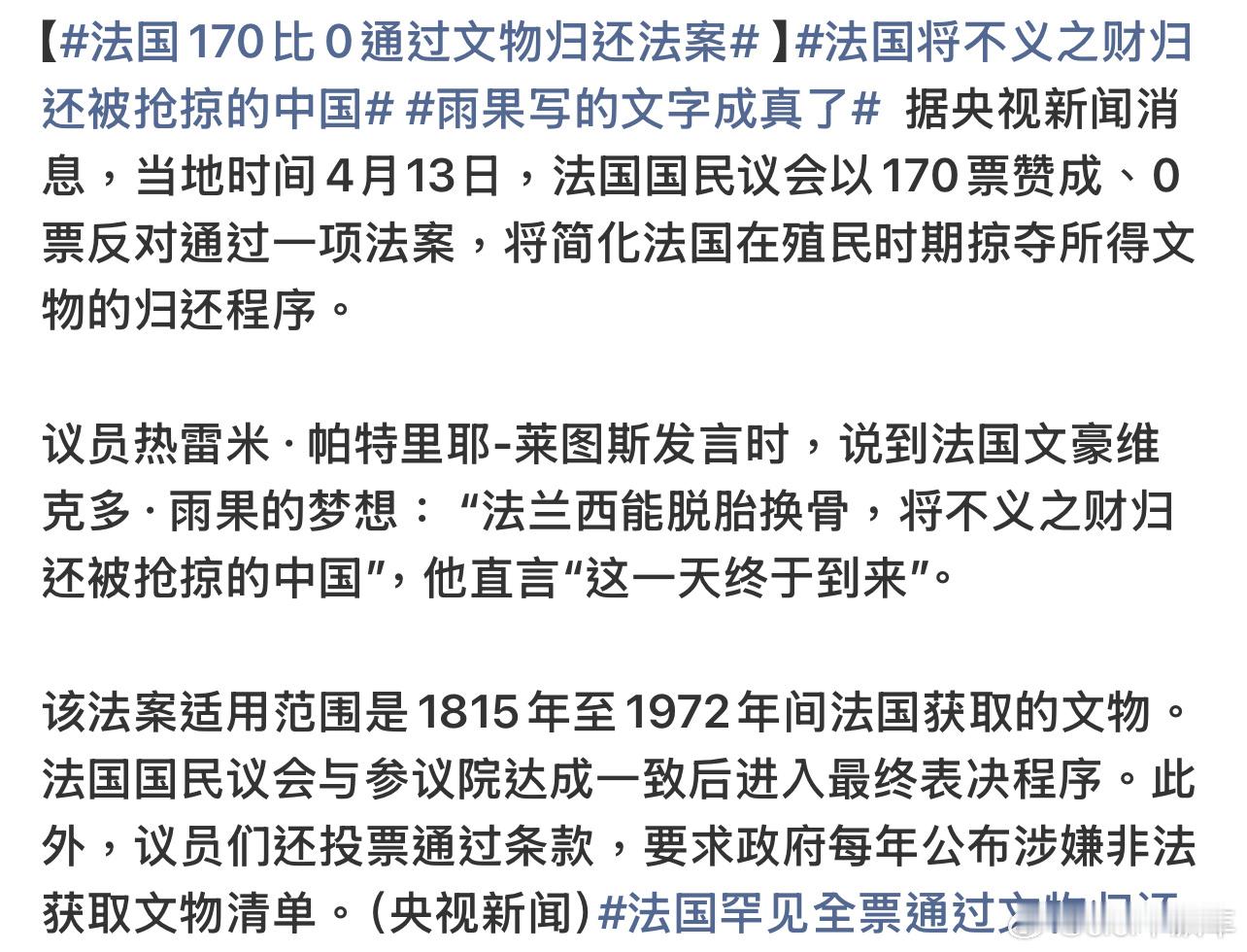 法国将不义之财归还被抢掠的中国法国通过了文物归还法案,将掠夺的文物归还,也证明了我们国家越来越强大,希望大英和小日子别装了。
