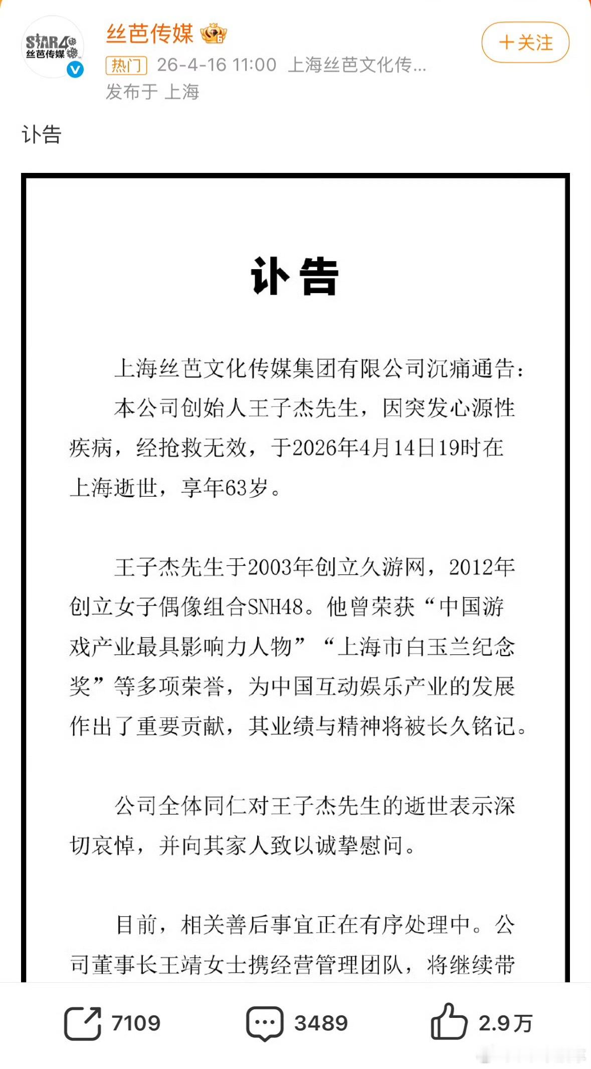 丝芭传媒官方发布讣告,创始人兼总裁王子杰先生,因突发心源性疾病经抢救无效于上海逝世他深耕文娱行业数十年,2003年创立久游网,2012年打造国内首个大型偶像团体SNH48,为中国互动娱乐产业发展留下深刻印记。