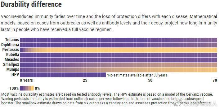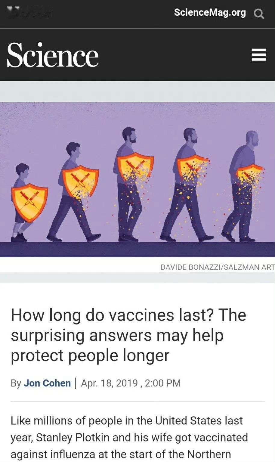 ³ SCIENCE期刊之前关注过疫苗效力问题。很多疫苗,比如HPV疫苗、天花疫苗能管终身。流感疫苗甚至一年都管不了,但能管一个流感高发季。比如,20%的美国人每年9月底打疫苗,但第二年1月、2月流感季高峰期时可能就不起任何作用。所以著名疫苗专家Stanley Plotkin和他的妻子每年10月初打一次,3个月后再打第二次。热点科普