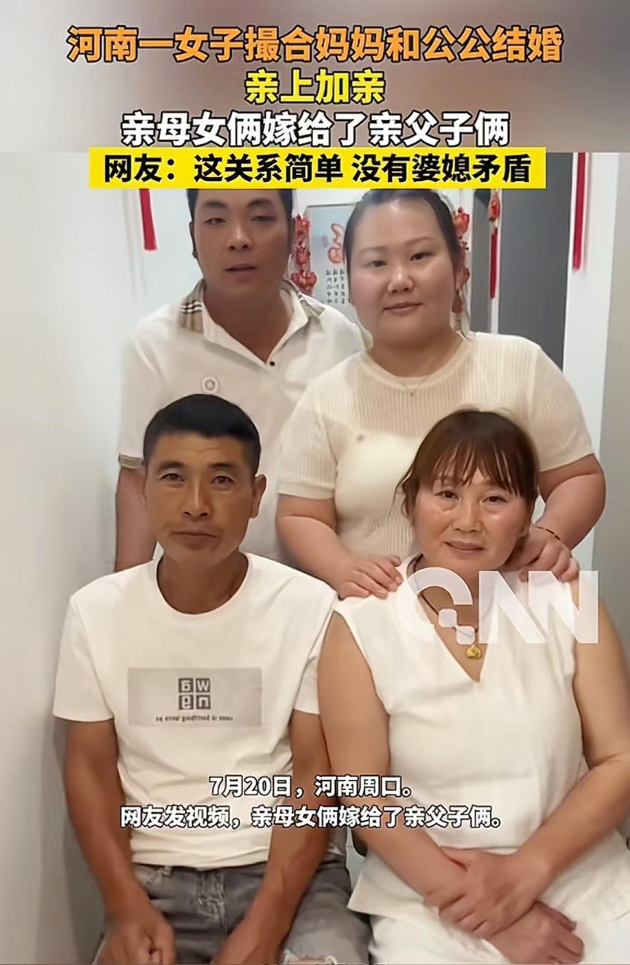 “彻底乱套了!”河南周口一女子结婚后,感觉公公比较孤单寂寞,竟然将自己的妈妈许配给了公公,亲母女俩嫁给了亲父子俩,四个人组建了一个新家庭!网友调侃:“这关系简单,没有婆媳关系”。 一碗冷面搁在灶台上,咸菜没动几口。 62岁的老人蹲在厨房门口,盯着那碗面发呆。这是2025年深秋某个傍晚,李娟推门回家时撞见的画面。 那一刻她心里像被什么东西攥了一下。 她想起电话里母亲的声音,58岁的人守着老房子,话头总是越来越轻。 丈夫王浩跑长途货运,一周才回一次家。照顾公公的担子,其实全压在她一个人肩上。 两个老人,两座孤岛,中间隔着她这个疲于奔命的摆渡人。 "让我妈搬过来,跟公公搭个伴?"这个想法蹦出来的时候,她自己都愣了一下。 没想到当晚跟王浩商量,他沉默半晌,竟点了头:"我爸一个人太久了,你妈也孤单,合得来就是好事。" 事情就这么定了。 头两周尴尬得要命。 两位老人说话客气得像邻居串门,饭桌上除了"多吃点""菜咸不咸",再找不出别的话头。 李娟成了那个强行撮合的人——撺掇公公讲年轻时的事,安排母亲教他做拿手菜,把邻里八卦嚼碎了当谈资。 转机来得悄无声息。 某天傍晚她提前下班,撞见公公拎着菜篮子跟在母亲身后,母亲挑菜,他付钱拎袋。又过几天,看见两人在小区散步,影子被路灯拉得很长。两个月后她分别找两位老人谈,他们没点头也没摇头,只是耳朵尖红了。 去民政局那天,四个人一起拍的合照,表情都有些复杂。 消息传开,街坊在巷子口聚成堆。 有人编段子说"父子婆媳一家亲",有人摇头说"不合老规矩",担心往后称呼乱套、孙辈婚恋受影响。李娟的母亲倒洒脱:"怎么顺口怎么叫,关起门来是一家,日子是自己过的。" 他们确实把规矩理清楚了。 李娟仍叫"公公"和"妈妈",王浩叫"岳母"和"爸爸",将来孩子喊"爷爷"和"姥姥"。 辈分是社会的,温度是自己的。 李娟还惦记着王浩的姑妈,寡居多年,子女在外地。 她没硬把人接来,只是常带公公去探望,有时接姑妈来小住。 几位老人凑在一起,倒像个自发形成的互助小组。 转眼半年过去,这个重组家庭的日子也有了稳稳的节奏。 清晨两位老人结伴去菜市场,傍晚在小区里散步遛弯;公公跟老棋友下棋时笑得合不拢嘴,婆婆也交到了跳广场舞的好姐妹。 李娟和王浩下班回来,桌上总有热饭,一家人围坐,烟火气里混着几句闲话。 那个对着冷面发呆的老人,现在碗里的咸菜总是吃得干干净净。 信息来源:(新晨晚报)