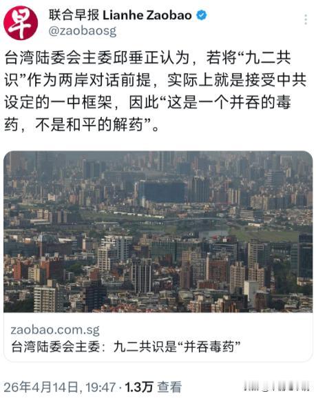 新加坡联合早报4月14日晚报道,台湾陆委会主委邱垂正认为,若将‘九二共识’作为两岸对话前提,实际上就是接受中共设定的一中框架,因此‘这是一个并吞的毒药! 说白了,邱垂正这番话,就是把两岸和平的唯一解药,硬生生说成了毒药,这已经不是简单的政治操弄,而是彻头彻尾的“绿色恐怖”宣言。 新加坡《联合早报》的报道,像一面镜子,照出了民进党当局如今的嘴脸,邱垂正作为陆委会主委,本应是两岸沟通的桥梁,现在却成了阻挠和平的绊脚石,他把“九二共识”污蔑成“并吞的毒药”,这颠倒黑白的本事,真是让人叹为观止。 要知道,“九二共识”的核心是“海峡两岸均坚持一个中国原则”,这是1992年两岸通过平等协商达成的共识,有完整的档案记录,不是什么“中共设定的框架”。 过去在“九二共识”基础上,两岸实现了全面“三通”,台湾的农渔产品零关税进入大陆,大陆游客赴台旅游带动了整个产业链的繁荣,据说,那几年台湾对大陆的贸易顺差每年都高达上千亿美元,这些都是台湾民众实实在在拿到手里的红利。 现在民进党上台,把这些红利全给掐断了,邱垂正们嘴上喊着“为台湾安全”,实际上却压缩了台湾的发展空间;嘴上说着“为民众好”,结果最先牺牲的恰恰是民生。 这就引出一个很有意思的问题:当年国民党执政时,民进党在野,那是处处使绊子,搞街头运动,搞舆论围攻,把国民党搞得焦头烂额,最后还成功把它赶下了台。 为什么现在角色互换,民进党执政了,就可以为所欲为地搞“绿色恐怖”,而国民党却好像没招了呢?为什么国民党不能用当年民进党对付自己的办法,去反制民进党呢? 我觉得,这背后是民进党把“抗中保台”玩成了选举工具,把民众利益当成了政治筹码,他们最怕的,不是政策本身,而是民众开始把注意力拉回到“实际获得”上。 一旦大家开始认真比较,到底是交流带来的机会多,还是对抗制造的风险大,他们那些靠情绪堆起来的话术,就会不攻自破,所以,他们必须把一切可能缓和两岸关系的主张,都扣上“卖台”的帽子,用“绿色恐怖”来威胁那些渴望交流的民众。 不过也无所谓了,我们大陆这边已经仁至义尽,大陆始终坚持和平统一、一国两制的基本方针,以最大诚意、尽最大努力争取和平统一的前景,但这种善意,不能被当成软弱可欺。 如果这种方式解决不了问题,那就换种方式,结果都一样,我现在看着邱垂正这帮人,已经没什么火气了,只觉得他们可悲,他们正在被历史潮流所抛弃,却还在做着“倚外谋独”的春秋大梦。 说到底,对于这种顽固的“台独”分子,就应该列入“台独分子名单”,台湾统一之时,无论他在何方,虽远必诛! 同时,也希望台湾岛内的进步力量能够勇敢地站出来,承担起打击“台独”分子的责任,就像这次率团访问大陆的国民党主席郑丽文,她顶住压力,推动两岸交流,这才是真正为台湾民众谋福祉。郑丽文雄起! 以上只是我个人的看法,大家怎么看?欢迎在评论区留言讨论。