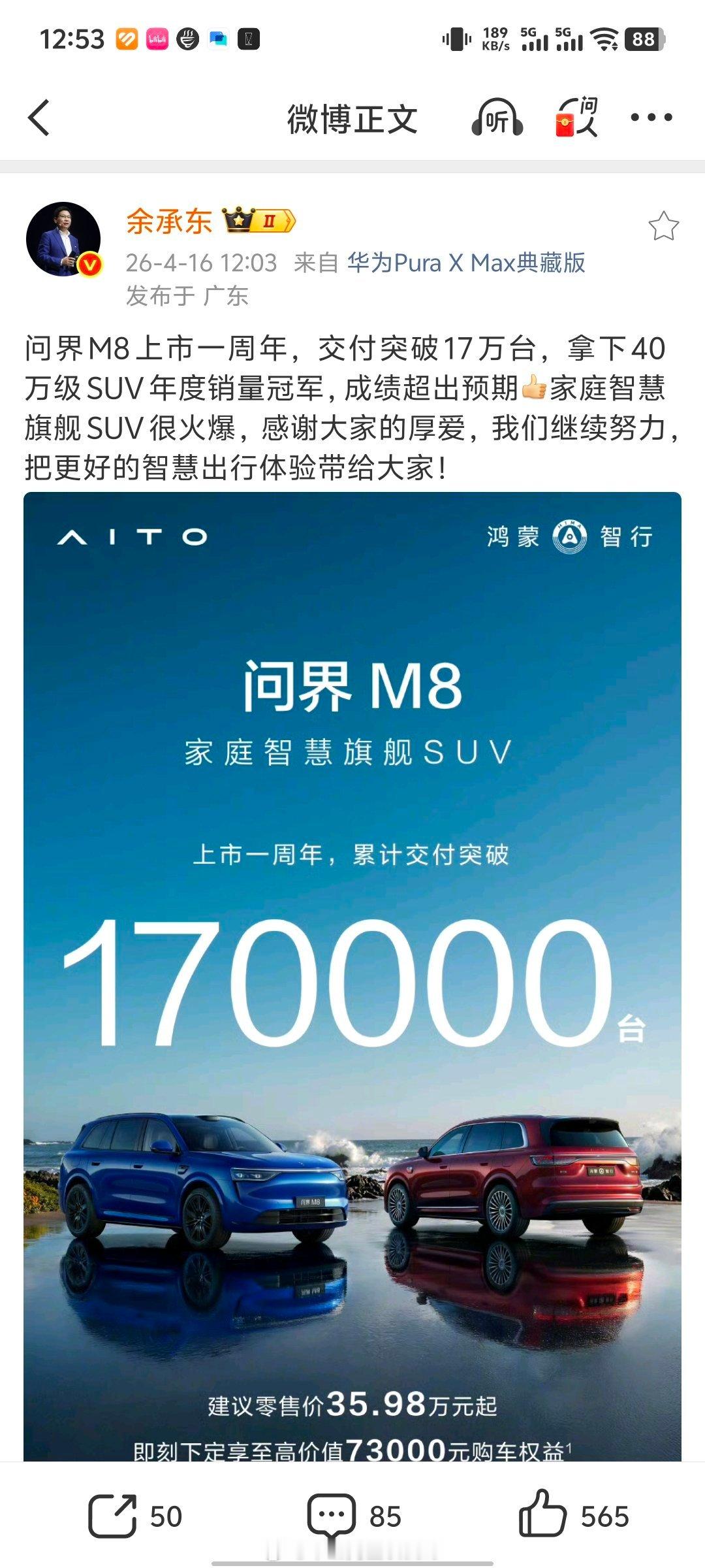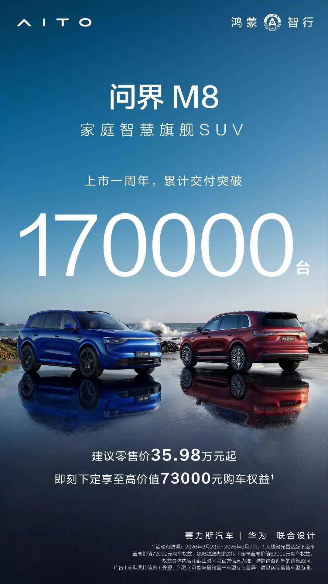 问界M8上市一年交付突破17万 一年时间,一款平均售价超过40万的SUV销量破17万台,确实太强大了,现在问界M系列可以为车主说话了,每次开问界,身边的人感觉对这车都很了解,辅助驾驶很牛,座舱很强大,座椅很舒适豪华,华为从赋能到背书,大家选择用钱投票~大v聊车