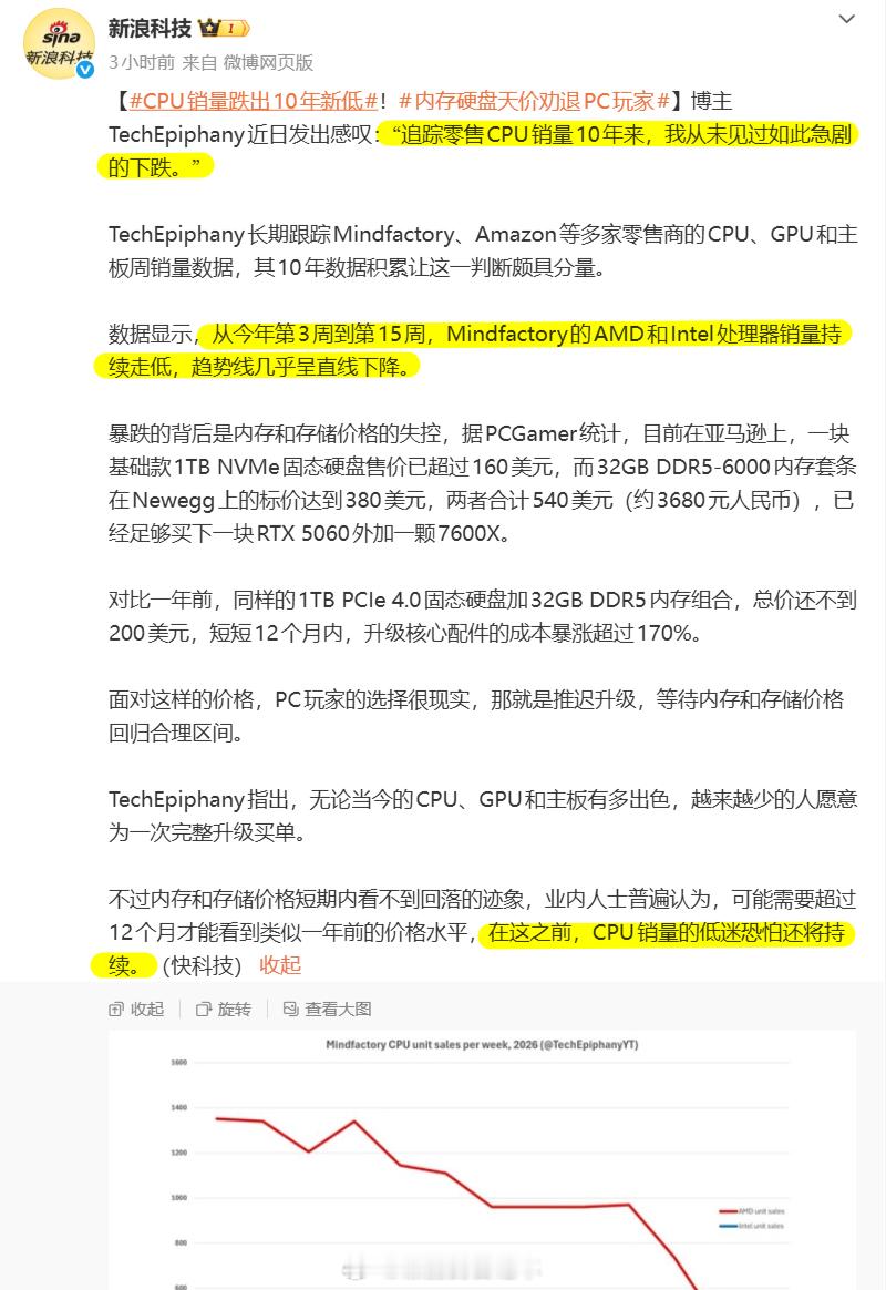 CPU销量跌出10年新低 当前行情对需更新CPU的用户而言,无疑是一大利好。