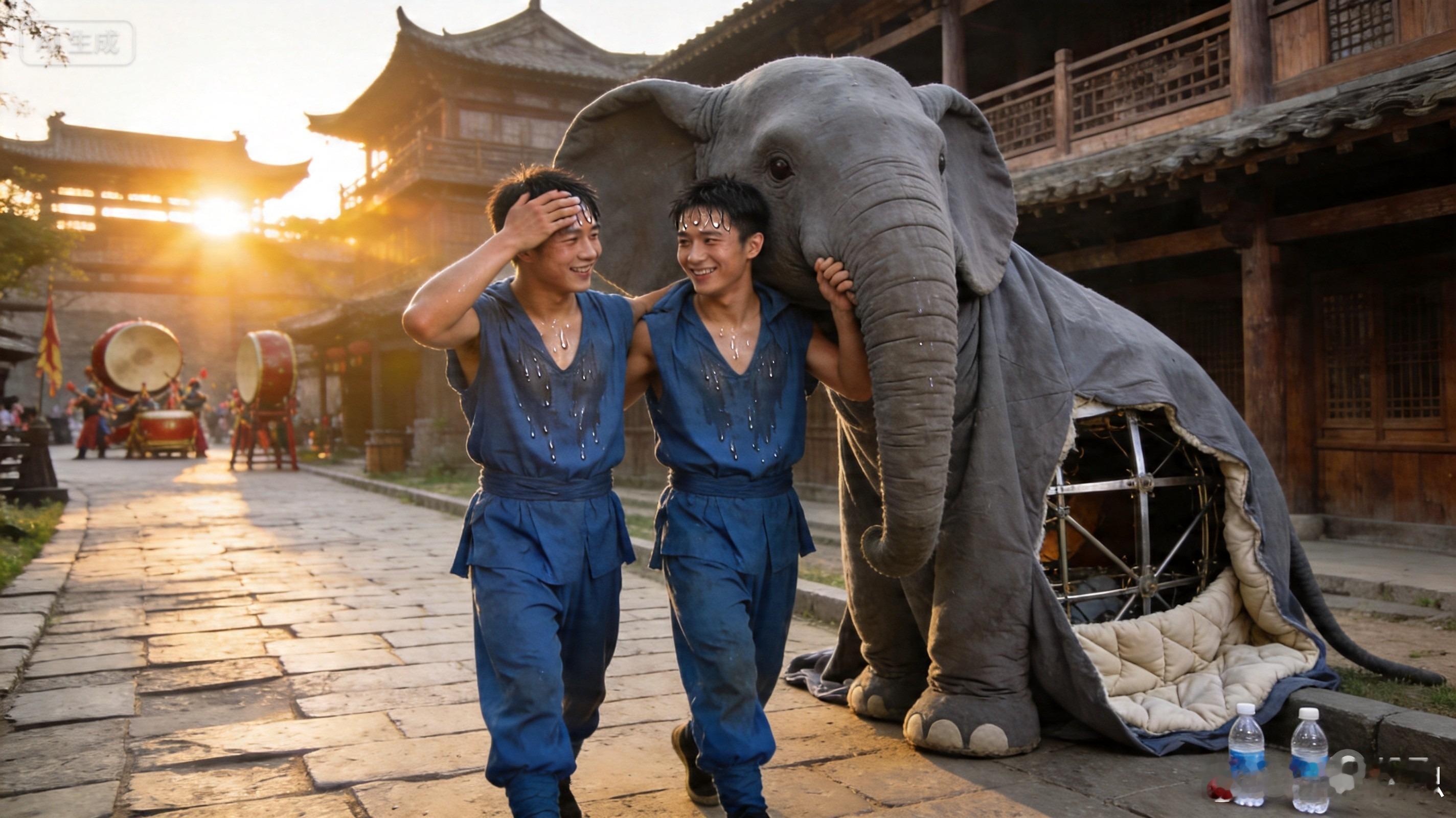 原来,这头大象的“本体”,是几位在模型里弓着腰、扛着道具走位的演员。他们藏在厚重的象皮之下,在万千游客面前卖力地表演着,只为了给大家呈现一个更梦幻的“武侠世界”。