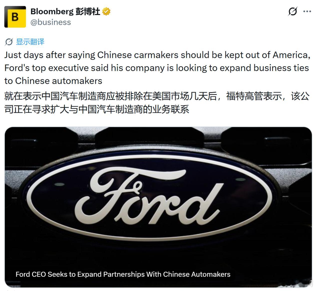 【彭博社】就在表示中国汽车制造商应被排除在美国市场几天后,福特高管表示,该公司正在寻求扩大与中国汽车制造商的业务联系。典型的吃饭砸锅型美国企业。美国对中国企业的制裁和封禁,少不了这样的美国大型跨国企业在后面游说。