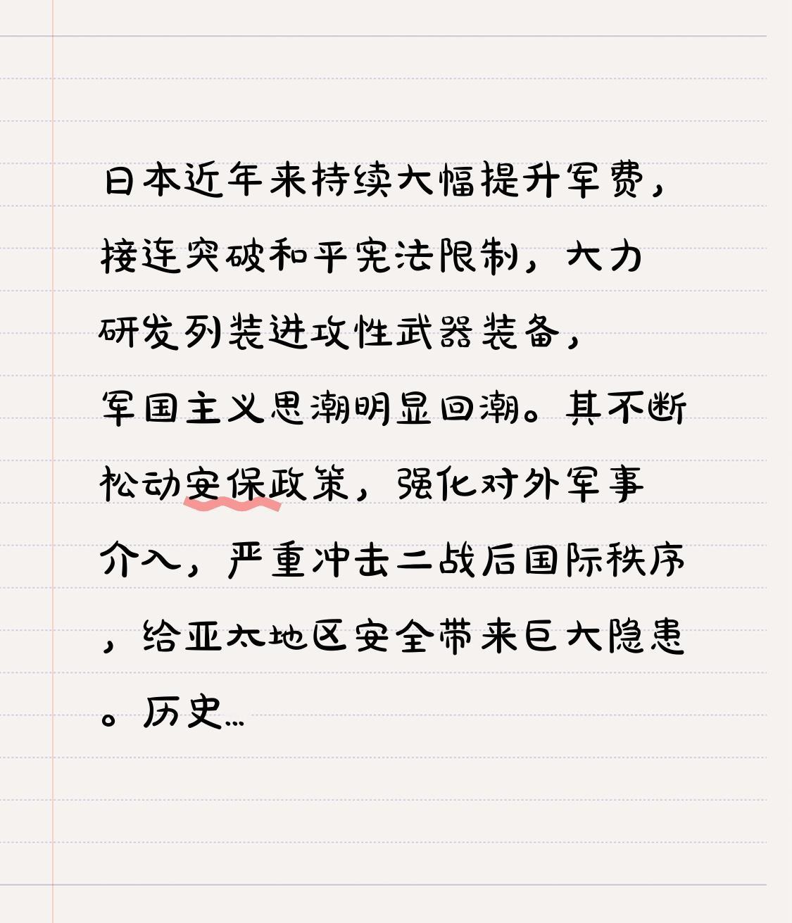 日本近年来持续大幅提升军费,接连突破和平宪法限制,大力研发列装进攻性武器装备,军国主义思潮明显回潮。其不断松动安保政策,强化对外军事介入,严重冲击二战后国际秩序,给亚太地区安全带来巨大隐患。历史早已证明,军国主义只会带来灾难,日本这种危险动向值得全世界高度警惕,绝不能让历史悲剧重演。 军事 日本 亚太安全
